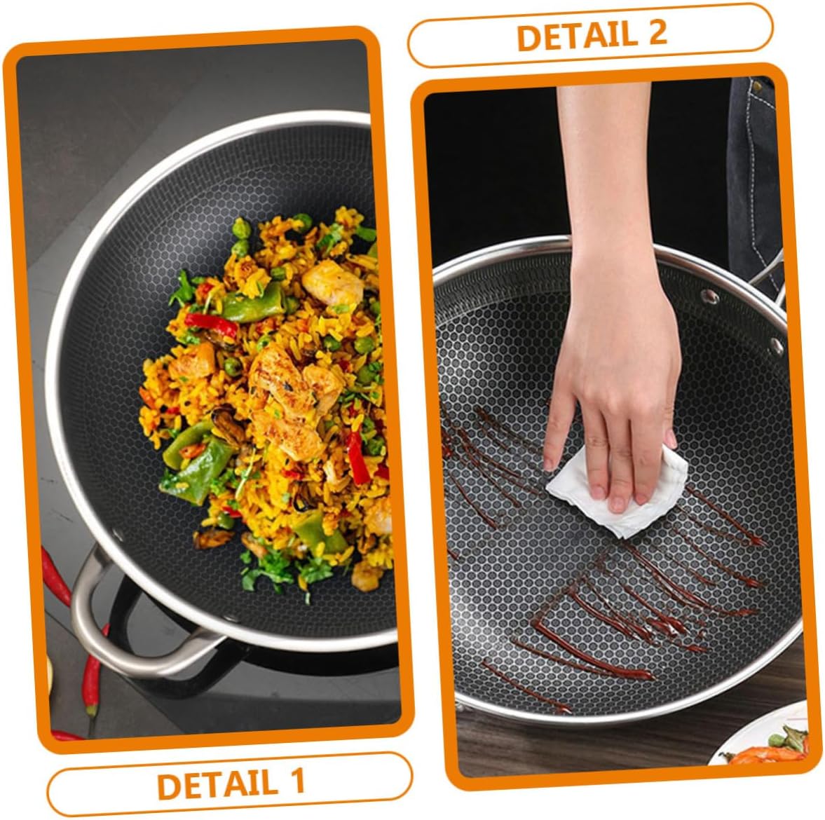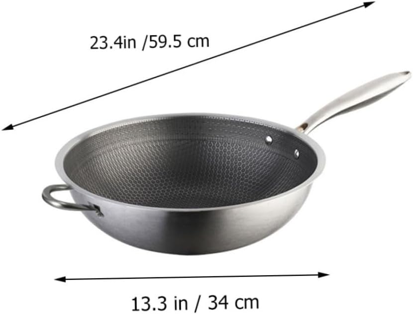 Package List 1 x stainless steel wok Features - Material:Stainless Steel induction stove wok - Size: 59.50X34.00X10.00cm/23.38X13.36X3.93in wok for electric stove - Stainless steel material and composite construction that is scratch resistant and abrasion resistant. Non-stick Cookware - ColorSilver No-stick Pan - Multipurpose design, this wok to handle fry, steam, cook, very practical. And this nonstick pot can make your cooking easier than before kitchen utensil. - The heat conduction is rapid and uniform, and the bottom of the pot is not deformed when heated wok for stoves. - Stainless steel frying pan is easy to clean after use, very practical. You can send it as a thoughtful present Traditional Wok. - The honeycomb structure to minimize the of the pan and food and prevent sticking. home wok panGoods Informationheavy duty wok pan This product is a frying wok pan, which is made of stainless steel material, with texture, safe and practical.gas stove wok A very practical accessory that will meet your needs well.Non Stick Wok Easy to install and use, it can be easily applied to your kitchen