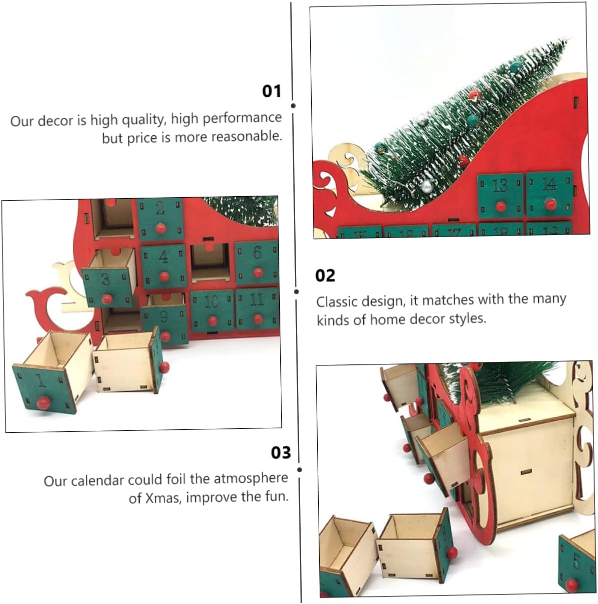 Package List 1 x Xmas ornament Characteristics -Material: wood ornament -Size: 28.20X22.00X8.50cm 11.08X8.65X3 christmas calendar box. -Color: Green indoor - The unique shape ensures its popularity and practicality ball. - The choice for presents such as Christmas friends plaster. - Made of materials, which can be used for a long time christmas snowman decoration. - The Christmas design decoration is classic but decoration. - Christmas decoration for desk, home, room, office, etc home decorations.Goods Description2023 xmas calendar Solid quality wood material is and environmental, Retro and classic design, the smooth surface and decoration will fresh you and your guests eyes, you don't need to see small number time by electronic product or paper calendar