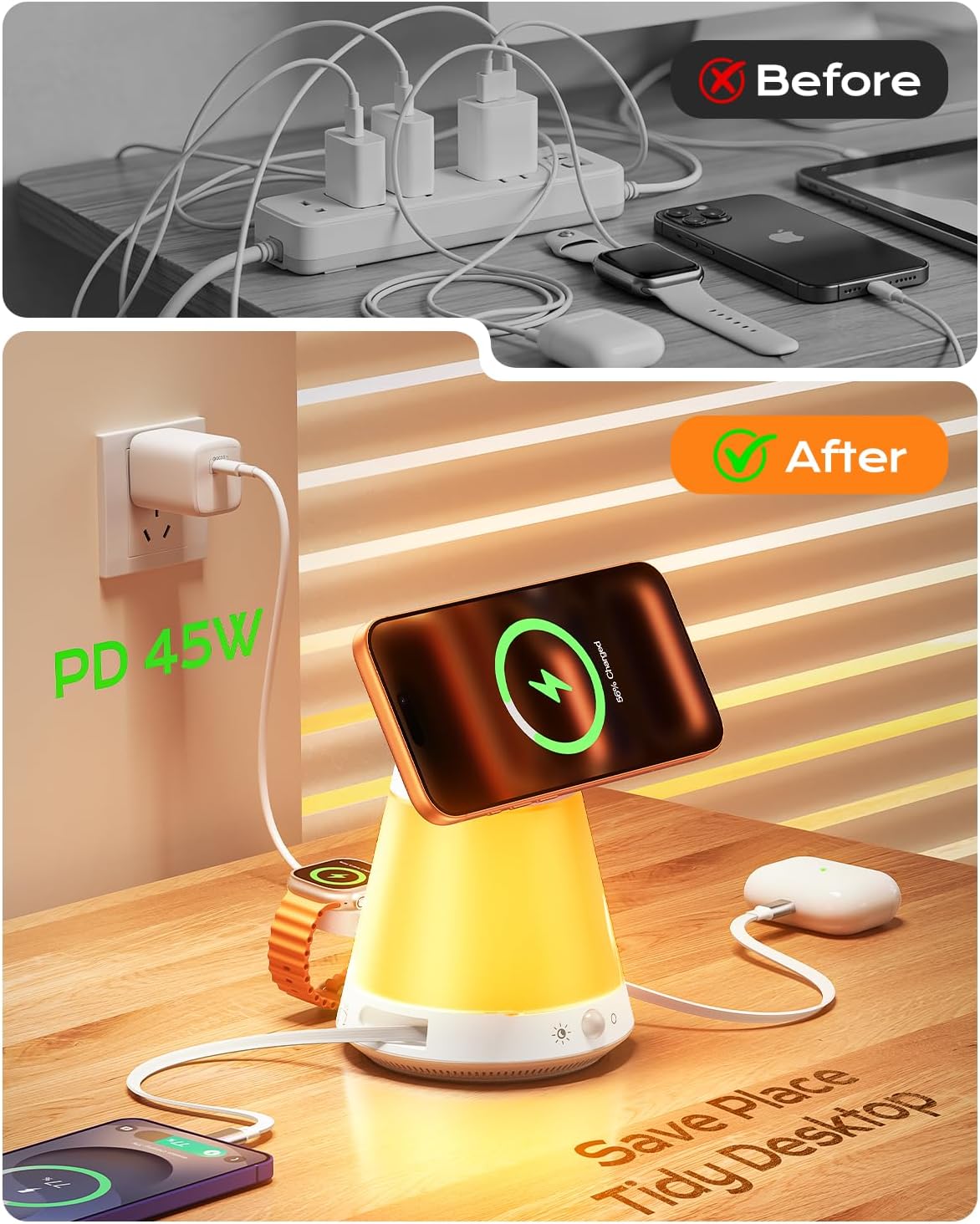 | Additional Features | 2.3 FT Type-C & Lightning Retractable Cable, Light + Motion Smart Sensor Night Light, Multi- Color Lighting, 45W USB-C Charging Set, Touch Brightness Adjustment, Strong Magnetic, 15W Max Fast Magnetic Charging |