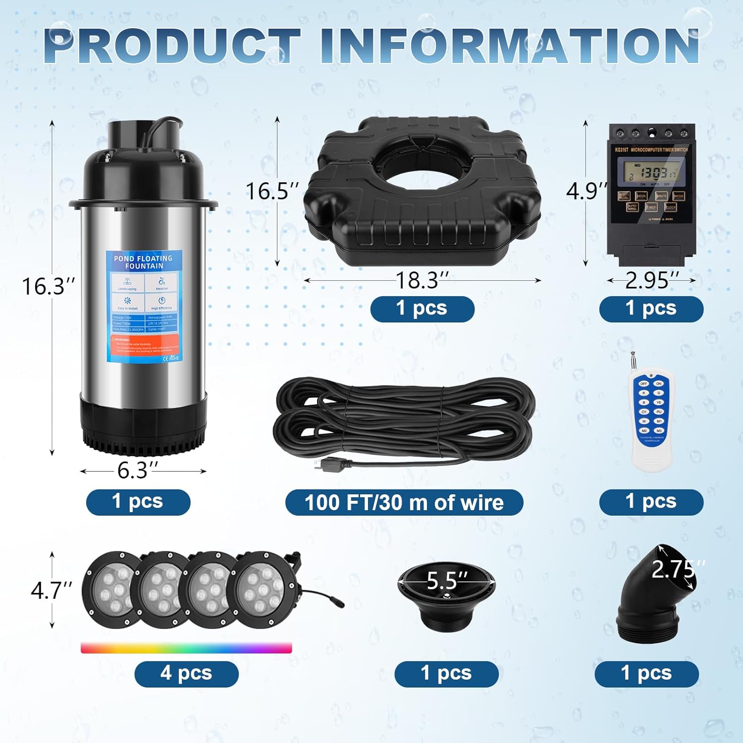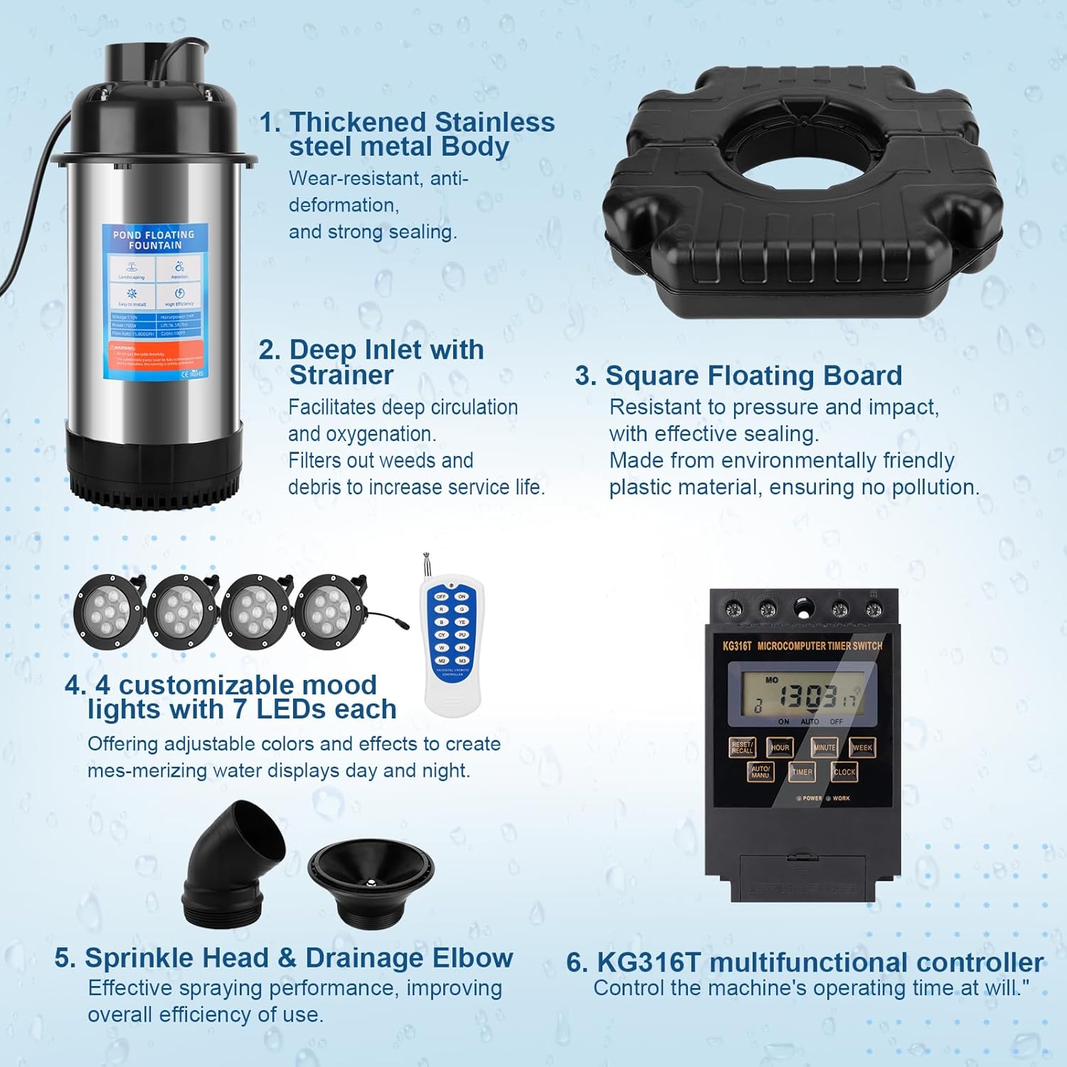Elevate Your Water Feature with Essenhome’s All-in-One Pond Solution Transform your pond or lake into a vibrant, healthy ecosystem with the Essenhome Upgraded Pond Fountain Aerator. This powerhouse combines robust 1HP/750W aeration with stunning visual effects, all built to last. Designed for water bodies up to 15000 GPH, it not only revitalizes your water by oxygenating it to support aquatic life but also turns it into a breathtaking centerpiece day and night. 🌟 Dynamic Lighting & Customizable Display Go beyond ordinary aeration with an enchanting light show. Equipped with 4 color-changing mood lights (each with 7 bright LEDs), you can adjust colors and effects to set the perfect ambiance. Choose between the two included interchangeable nozzles to create either a dramatic V-shaped spray or an elegant parabola-shaped fountain, tailoring the water display to your style. ⚙️ Built to Endure with Superior Performance At its core lies a corrosion-resistant stainless steel body that guarantees durability against the elements. The high-performance pump delivers powerful circulation and aeration up to 15000 GPH, while the low-profile float design ensures steady, quiet operation in outdoor ponds and lakes of various sizes. 🔌 Simple Setup, Instant Enjoyment Enjoy a true plug-and-play experience. Installation takes just minutes—simply connect the cable to the float, secure the unit with the provided weights/stakes, and plug the long 100ft submersible power cord into any standard 110V outlet. No technical expertise or complicated wiring is needed. 💡 Energy-Smart & Eco-Conscious Operation Engineered for efficiency, the powerful 1HP motor performs effectively even in shallow water depths from 18 inches, ensuring broad applicability. The integrated LED lights are designed for low power consumption, allowing you to maintain a dazzling and eco-friendly water feature sustainably. ✅ Reliable Design for Year-Round Peace of Mind Constructed with a wear-resistant ceramic rotating shaft and fully waterproof housing, this aerator pump resists corrosion and extends product life. Take full control with the included multifunctional timer, enabling you to customize operation cycles for optimal energy use, a healthier pond ecosystem, and consistent performance in all seasons. Complete Kit Includes: Pond Aerator with 4 Mood Lights, 2 Interchangeable Nozzles (V-shape & Parabola), 100ft Waterproof Power Cord, Stainless Steel Float, Weights/Stakes, and 24-Hour Timer. Ideal for gardeners, homeowners, and property managers looking to enhance water quality, prevent stagnation, and add spectacular visual appeal to their ponds, lakes, or large water gardens. Let the Essenhome Aerator bring life, light, and movement to your outdoor space.