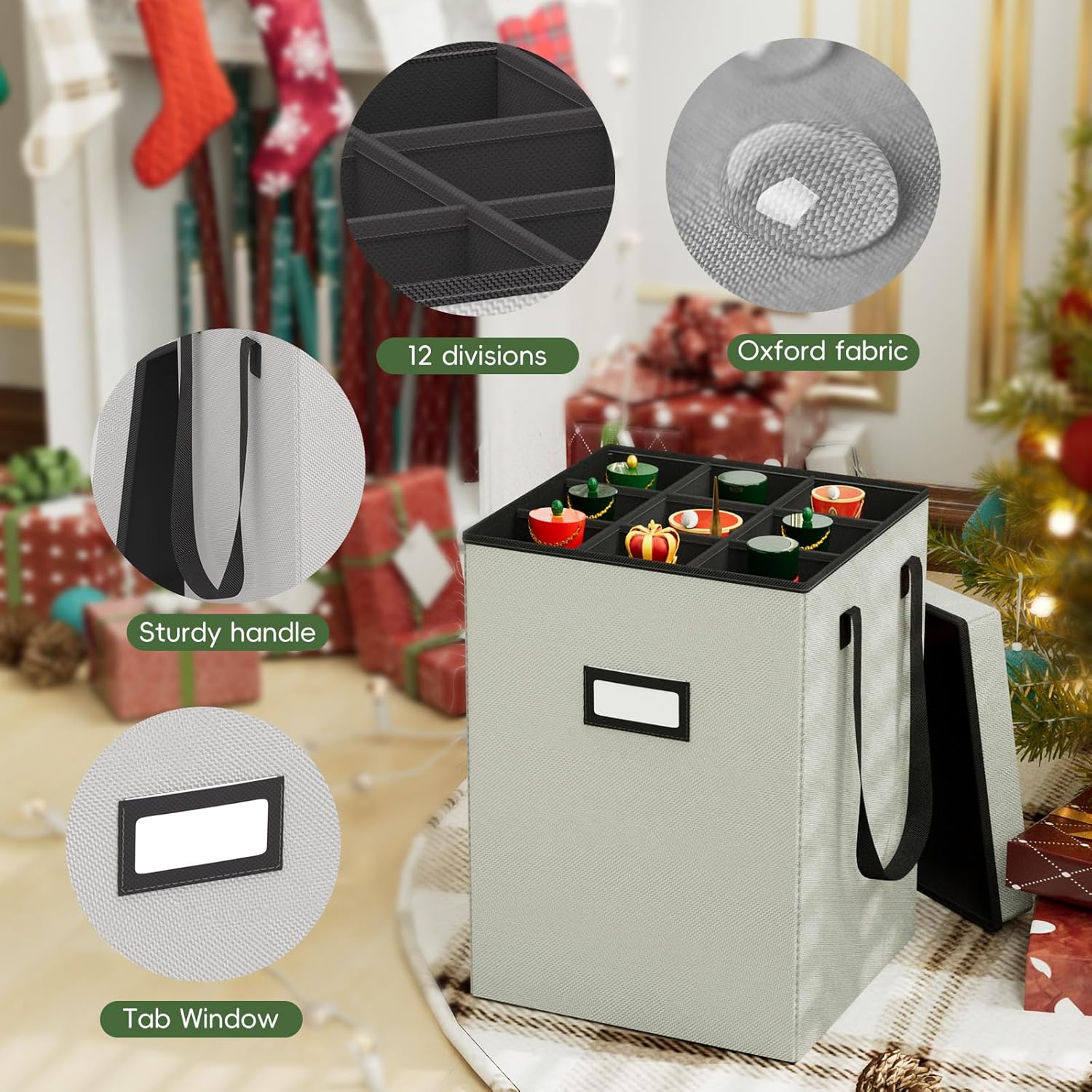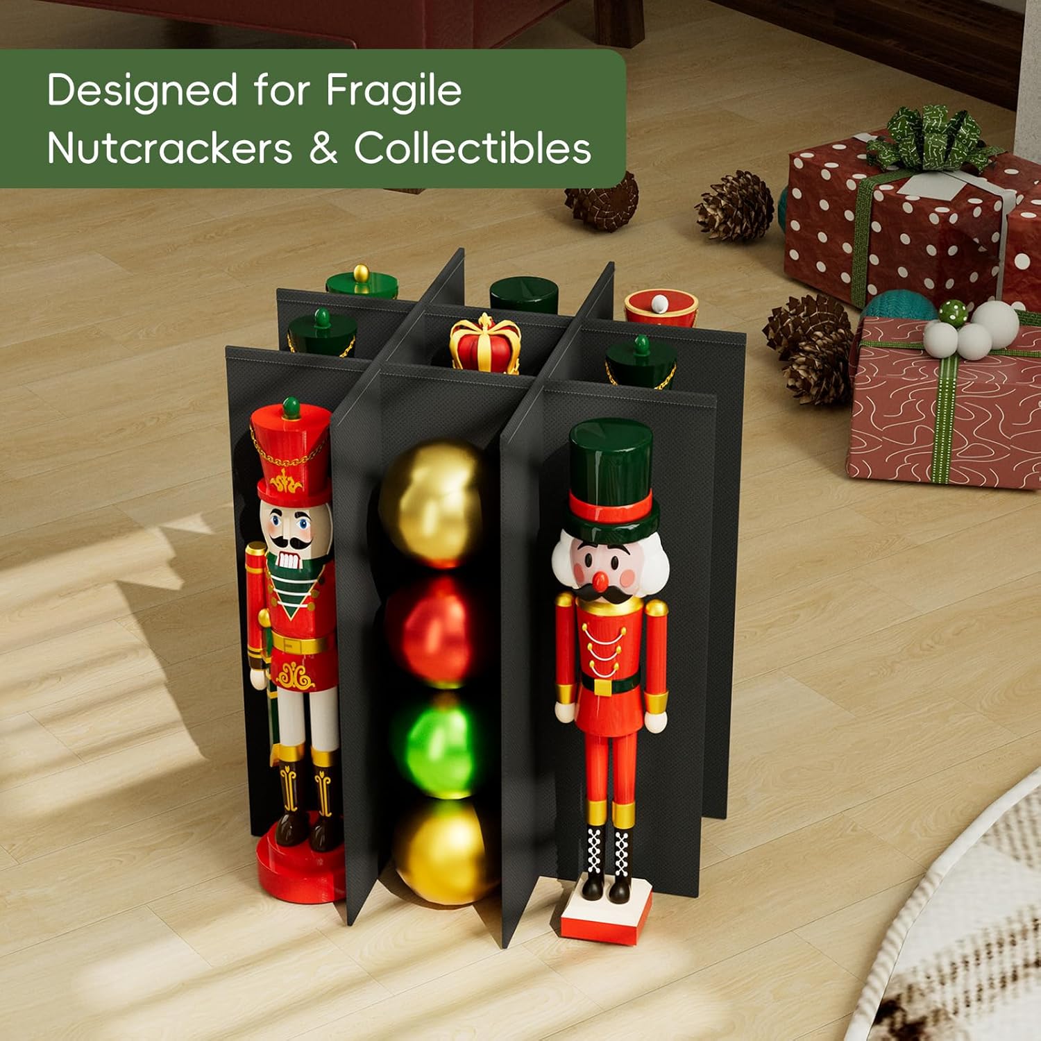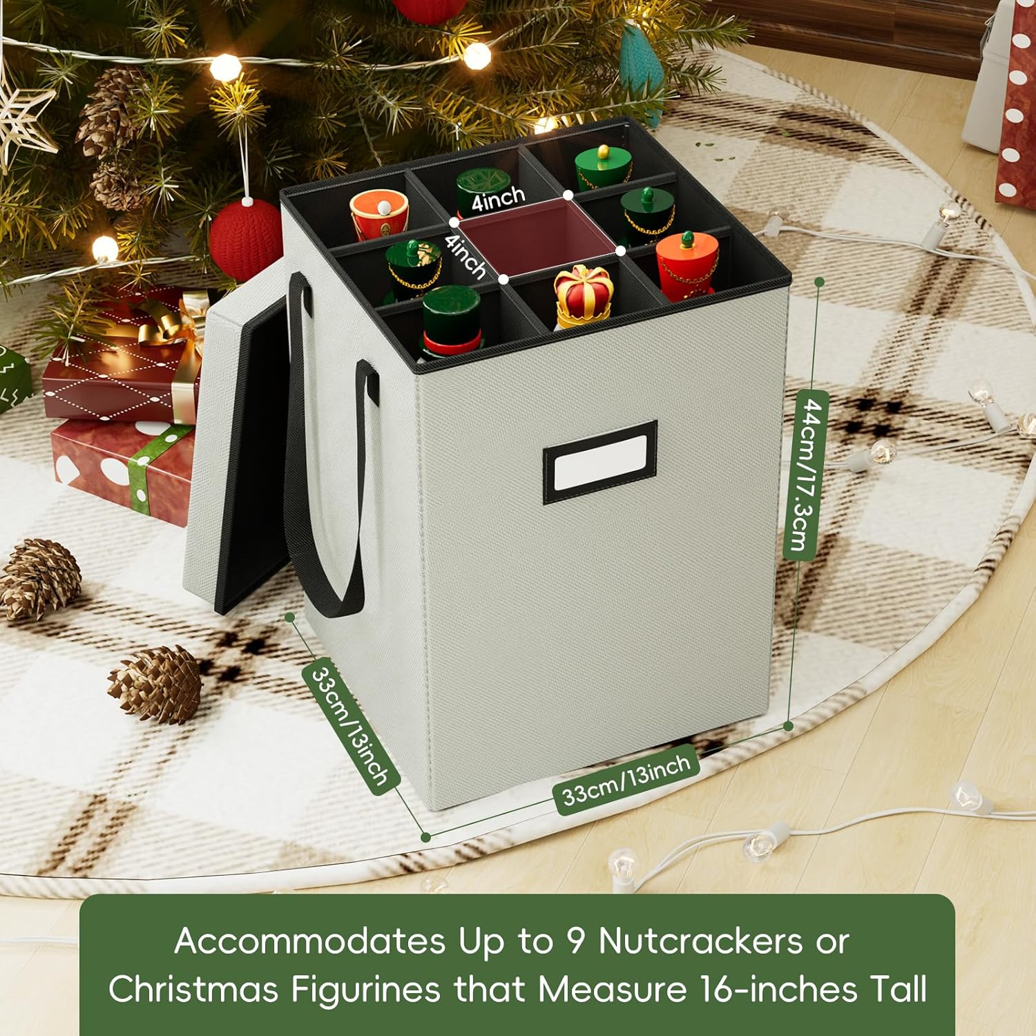Protect & Organize Your Prized Collections:Safeguard your delicate nutcrackers, figurines, and holiday heirlooms with our purpose-built storage box. Forget flimsy original packaging or dusty plastic bins. We offer a dedicated, secure home to ensure your fragile decor remains pristine, season after season. (Note: Nutcrackers/Figurines not included). Sturdy Handle for Hassle-Free Transport:Tired of carrying christmas storage boxes clumsily in your arms? Our integrated handle allows you to securely and comfortably lift the nutcracker ornament storage box. Simplify your post-holiday cleanup and redecorating by moving all your figurines at once. Built for Standard 16" Nutcrackers & Figurines:Fits most collectible figurines! Specially designed with 16-inch height capacity. The internal dimensions (17"L x 13"W x 13"H) are optimized to hold up to 9 standard-sized nutcrackers or figurines, saving space and reducing clutter in your storage area. An Ideal Choice This Holiday Season: Not just for nutcrackers! Remove the dividers to store lights, garlands, tree skirts, and dolls. The clear label slot allows for instant content identification. It's the all-in-one solution for organizing your entire holiday decor collection. Effortless Seasonal Setup & Cleanup:Make holiday christmas decor decorating a joy, not a chore. Find, unpack, and repack your decor with ease. Our organized system saves you precious time and frustration after the holidays, keeping your collectibles perfectly sorted and ready for next season.