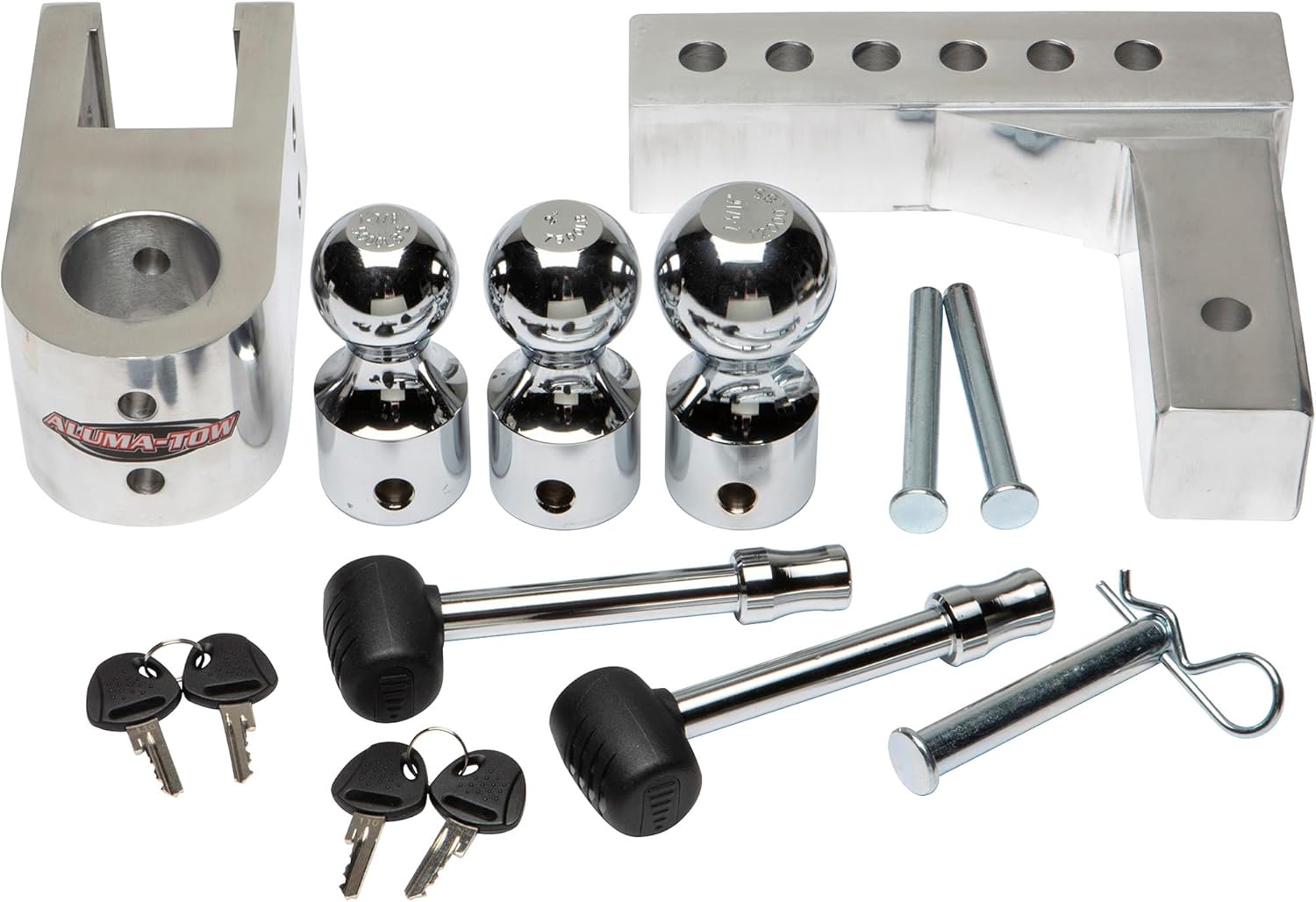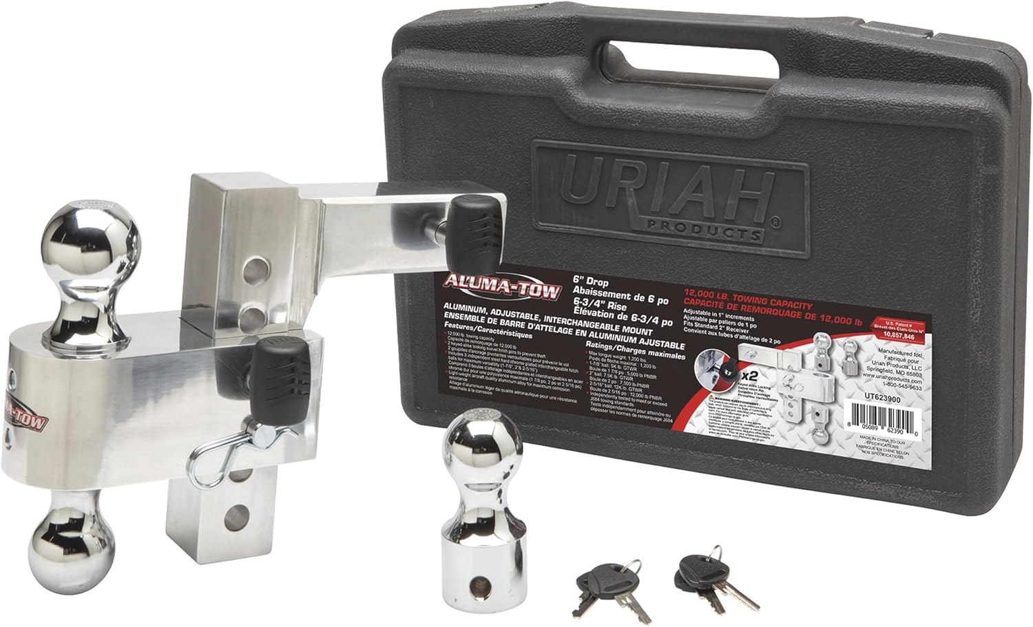 The Uriah Products Aluma-Tow Adjustable Aluminum Ball Mount with Case provides you with one product for all of your towing needs. It has the high rated gross trailer weight of 12,000 lbs., allowing you to haul heavier loads with ease. The adjustable ball mount fits into a standard 2in. square receiver. It has a 6in. max drop distance and a 6 3/4in. max. rise distance (adjustable in 1in. increments). Included are 3in.dependent chrome-plated steel interchangeable hitch balls (1 7/8in., 2in. and 2 5/16in.) covering all vehicle sizes. The aircraft quality aluminum alloy body design cannot rust and makes the product lightweight, while also providing maximum strength. The kit includes two locking hitch pins with 4 keyed-alike keys that prevents theft while connected to your vehicle. Comes with a convenient heavy-duty carrying case to transport and store the hitch mount, tools, and extra hitch balls.