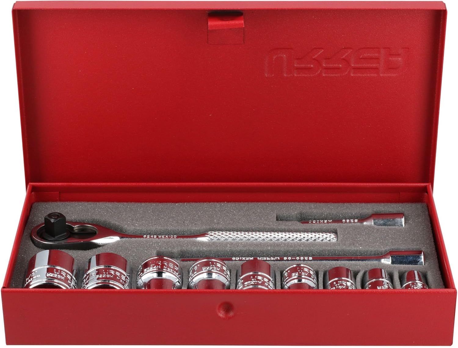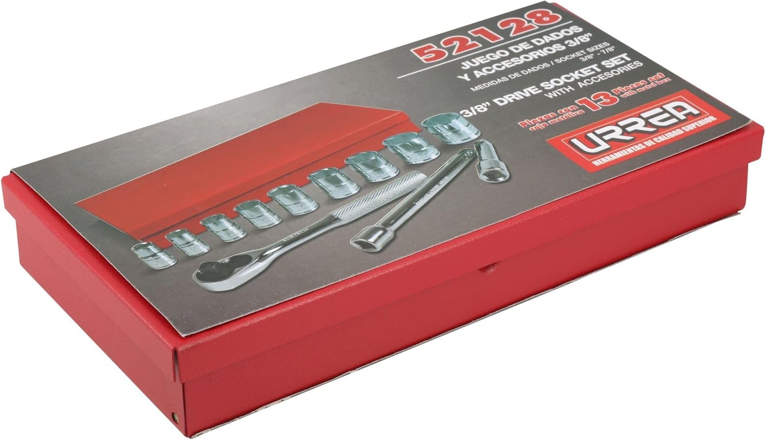 Sae 6-point, 3/8” drive sockets with accessories in metal case. 13-Piece set the Urrea socket line is made of high-quality steel, resulting in outstanding performance on the job. They feature a chrome-nickel finish to prevent corrosion. Allow you to work on screws with Torx drive.
