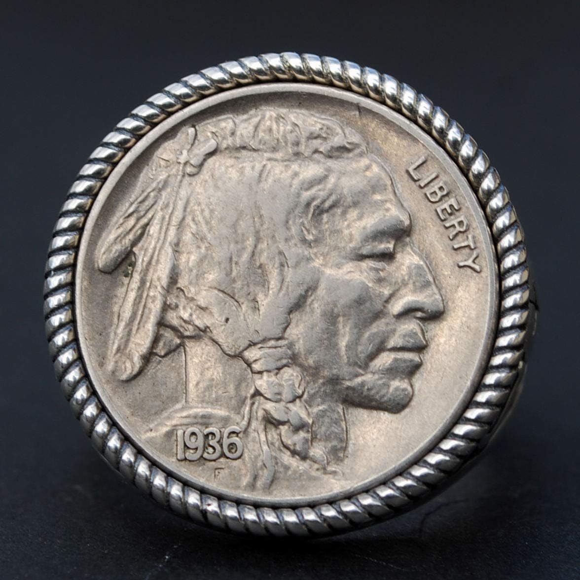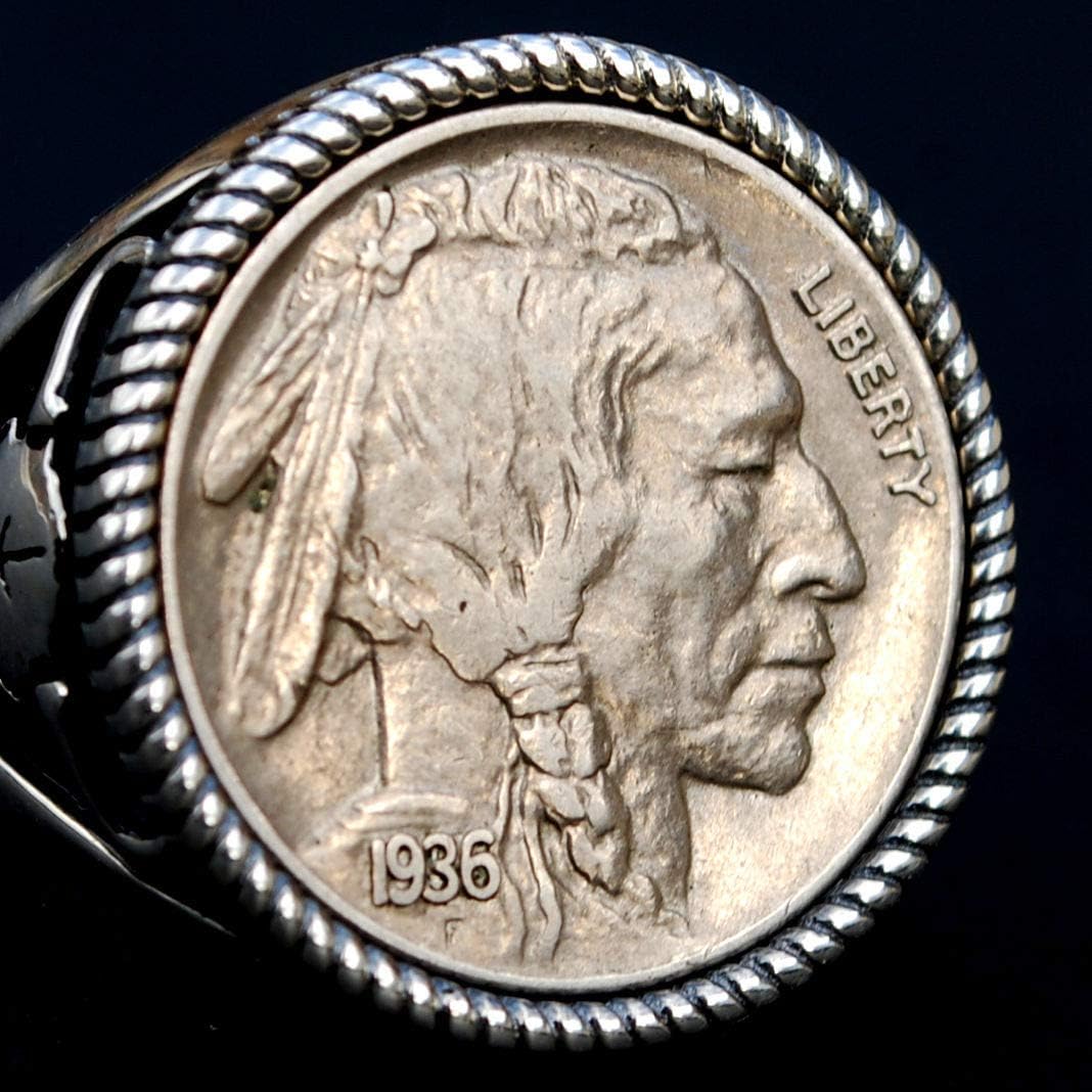 Splendid 925 Sterling Silver Signet Ring - Buffalo Skull Design. Hand-made. Antique style oxidized. The ring is set with a genuine US 1936 Indian Head Buffalo Nickel AU Coin, showing OBVERSE in front - Indian Head. Great detail, nice depth, and beautiful contrast. I only use these coins with readable dates, never try to clean them, and always keep their collectible and numismatic values. I designed and made the ring. The ring is NEW and never used. Maker's mark: JT. Stamped: 925.