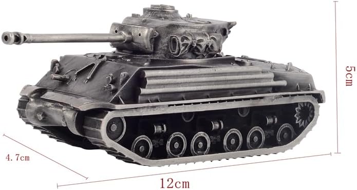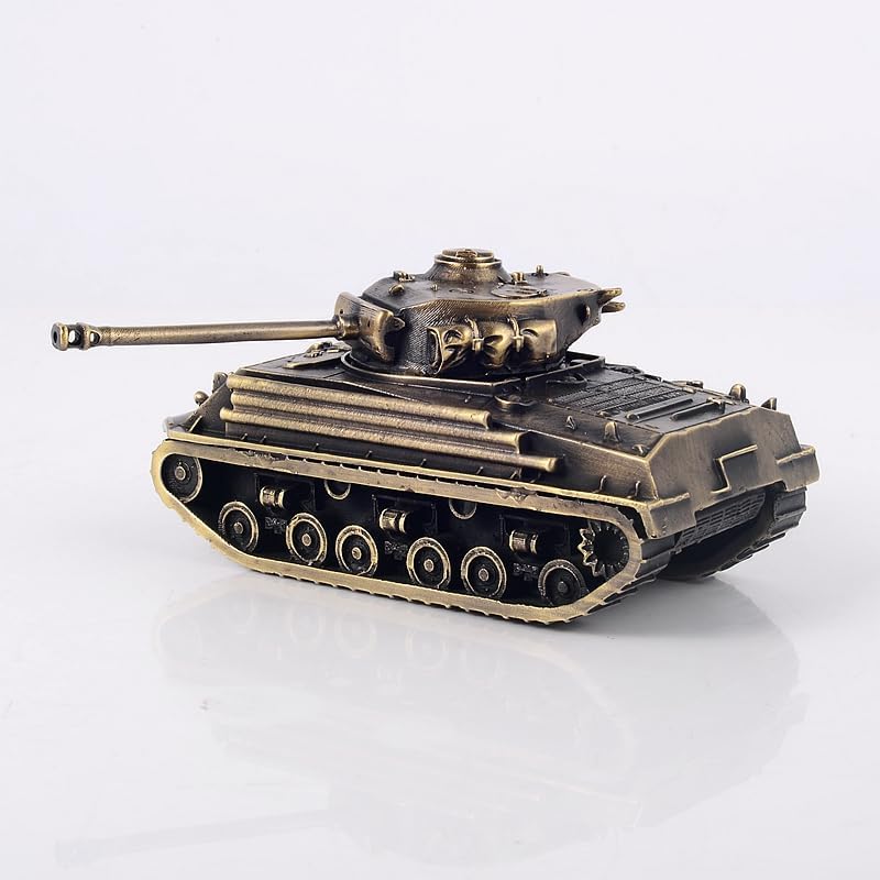 This is a metal model of a tank, which is a historical replica of the famous US Medium Tank M4A3E8 Sherman during World War II. The main body of the model is cast using zinc alloy, and we produce two colors: bronze surface plated with copper alloy and antique silver surface plated with tin alloy. The turret can be rotated 360 degrees horizontally and disassembled, and the tracks are stationary and immobile. Its overall length is 13cm/5.12in, the length of the body is 10cm/3.94in, the width is 4.7cm/1.85in, the height is 5 cm/1.97in, and the weight is about 445 grams