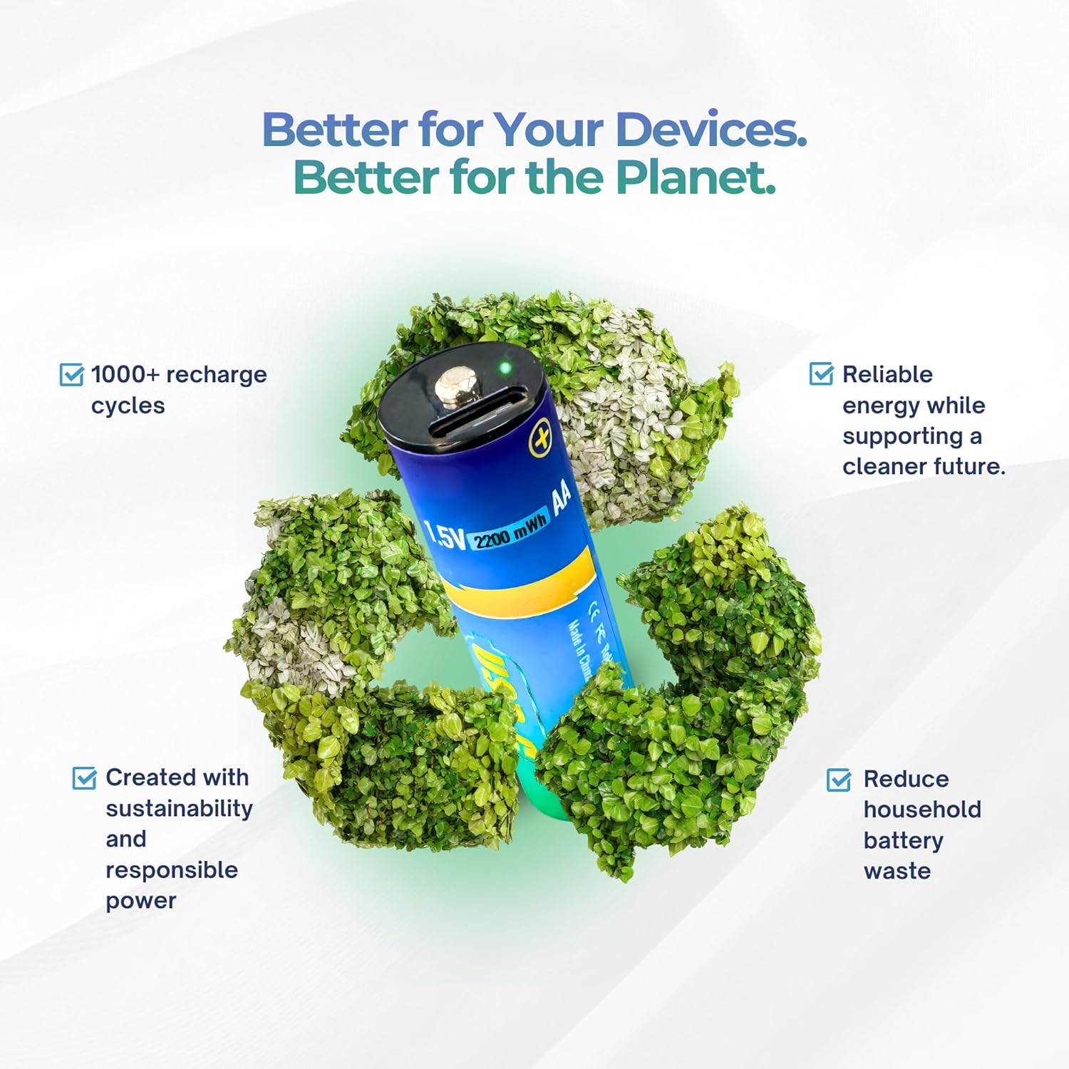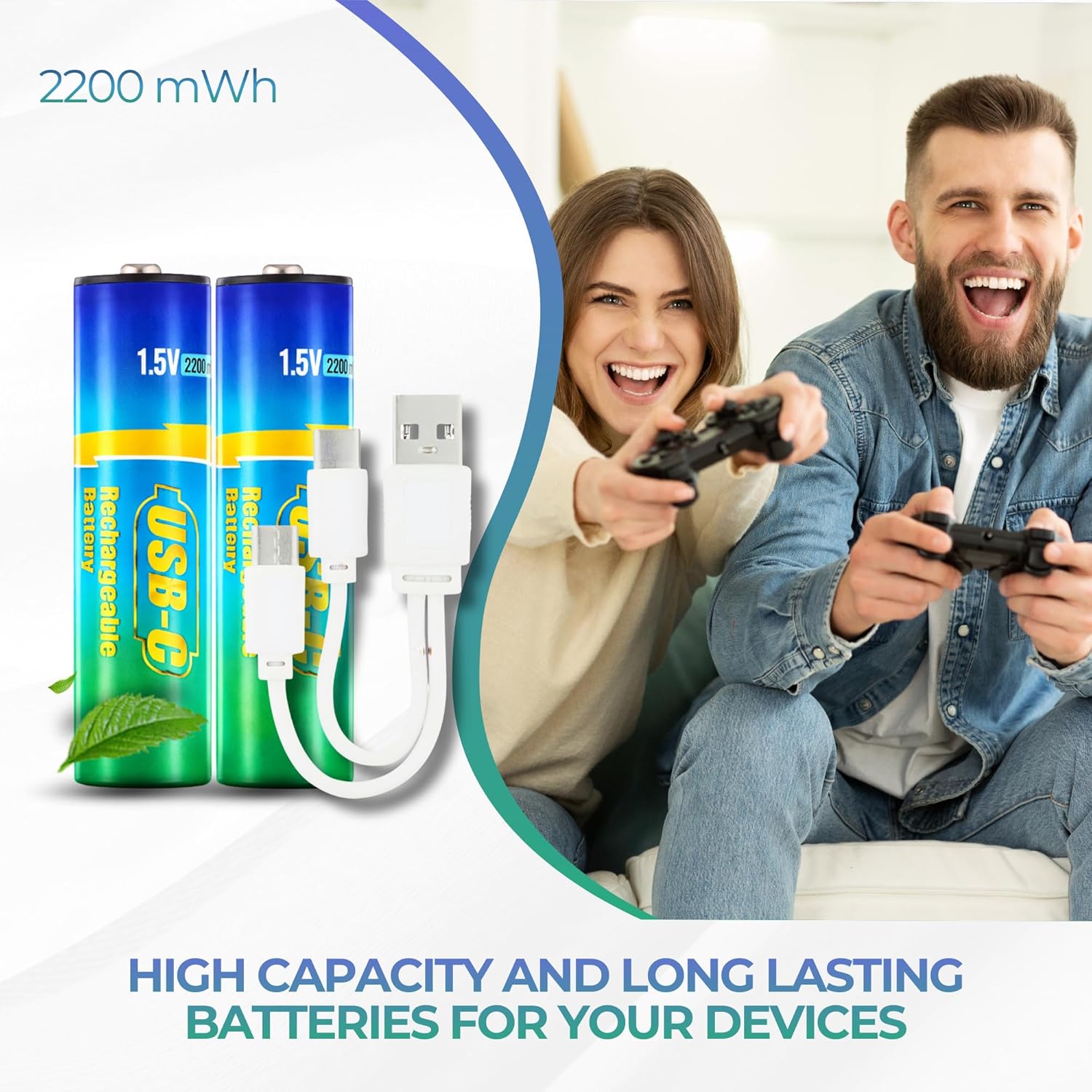 Power up your devices with these innovative USB-C rechargeable AA batteries from GreenVault. Featuring a high capacity of 2200mWh and 1.5V output, these batteries offer reliable performance for your everyday electronics. The included Type-C cable enables convenient fast charging, eliminating the need for separate battery chargers. This 2-pack of rechargeable batteries helps reduce waste while providing consistent power output. The LED indicator lets you monitor charging status, and the batteries are designed with built-in protection features. Perfect for digital cameras, remote controls, toys, and other battery-operated devices, these USB-C rechargeable batteries combine modern charging convenience with reliable performance. The compact design maintains standard AA size compatibility while incorporating advanced charging technology. For optimal performance, fully charge before first use and recharge when power is depleted. **Flashing Green LED indicates charging in progress. **Stable Green LED indicates charging completed.
