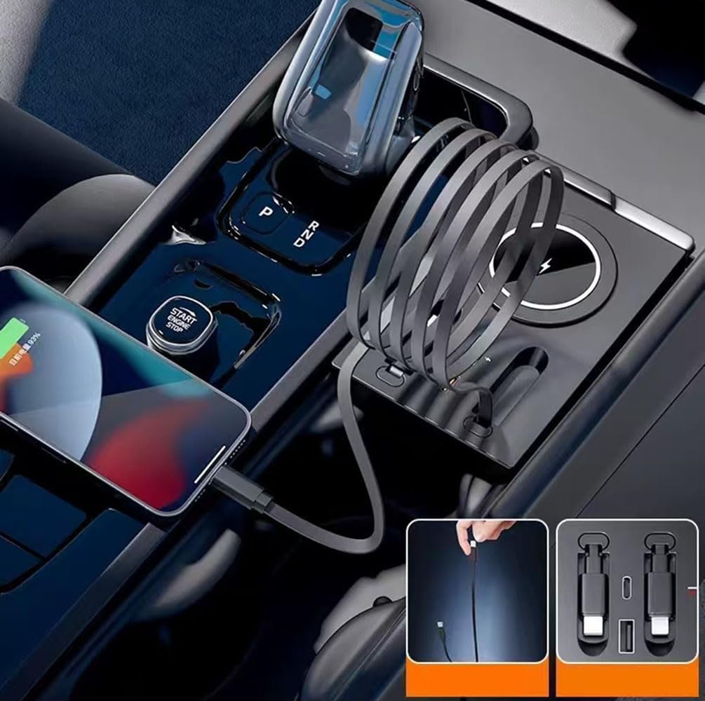 For Volvo USB hub features two retractable fast-charging cables (each is 2.6FT in length), one Lightning port, and one USB-C port, it is suitable for Android and Apple phones, as well as iPads, and digital cameras,one is a 45W Apple charging cable, and the other is an 45W Type-C charging cable
