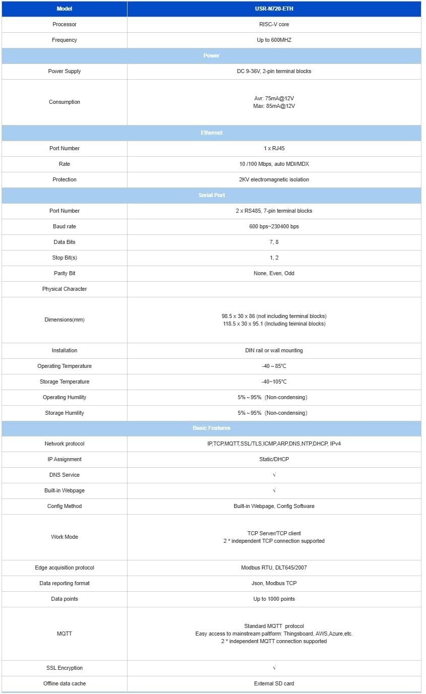 USR-N720-ETH is the next generation edge IoT gateway which support edge computing, data acquisiton, protocol conversion and data reporting in json format. It comes with 2 RS485 ports and 1 RJ45 ports which can quickly establish the connection between industrial field equipment and the cloud. With these features, it can be widely used in various fields such as smart factories, smart grid, smart water service and so on. Key Features Multiple Interface: Ethernet+2*RS485 Powerful Edge Computing Capabilities: 1000 points+data acquisition+analysis Data Encryption: Compatible with TCP+SSL, MQTT+SSL Protocol Conversion: Modbus to MQTT+Json, DL645 to MQTT+Json Rich Communication Protocol: Compatible with TCP/MQTT SD Card for Data Storage:To ensure data integrity Edge Computing,Enabling Edge Device Connectivity In The IIOT Era USR-N720-ETH can collected data in Modbus RTU, Modbus TCP-compatible and DL/T645-2007 protocol and reporting data to IoT cloud in JSON format using MQTT or TCP-compatible protocol. It supports up to 1000 data points, and can decode and compute the collected data to reduce server’s pressure. It support up to 5 connections with different remote survice, including 2*MQTT, 2*TCP-compatible and 1*PUSR connection. For MQTT and TCP-compatible connections, users can enable SSL encryption to ensure data security. USR-N720-ETH supports SD card for data caching, the collected data will be cached tothe SD card when the gateway is in Internet disconnection. And the cached data will be sent to server when the gateway get connection recovery. Remote Management over PUSR Cloud Users can monitor the running status, upgrade firmware, configure parameters of the N720 remotely, saving users time and cost.