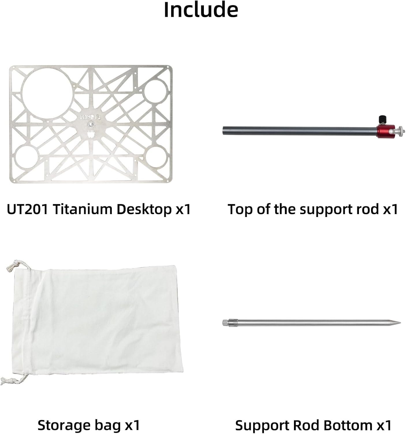 Product Specifications: Product Name: UT201 Material: Titanium Weight (including accessories): 466g Weight (Desktop): 180g Desktop Size: 29.6x20.8 cm Installation Dimensions: 29.6x20.8 x 61(H) cm Support Rod Length: 61cm Accessories: Desktop x 1, Aluminum Alloy Support Rod x 1, Storage Bag x 1.