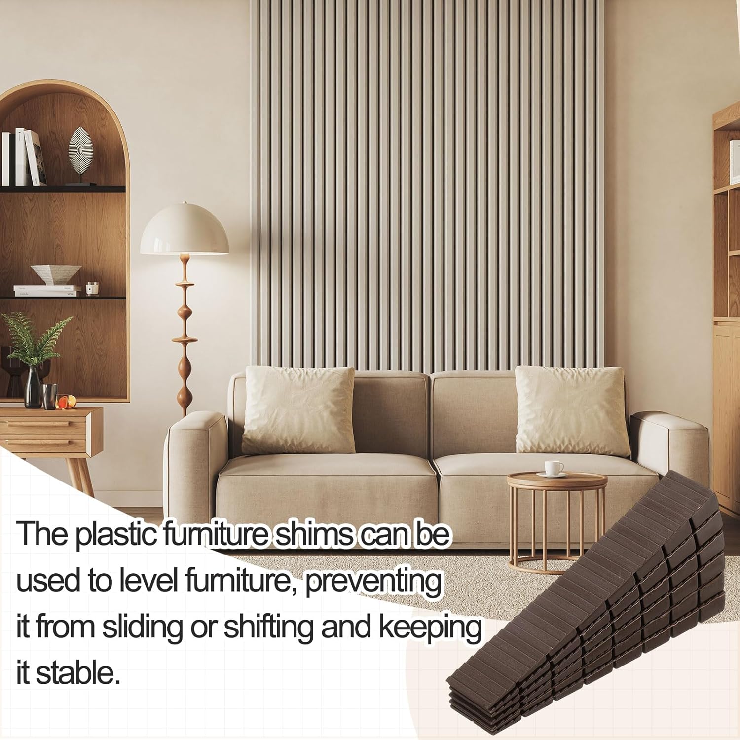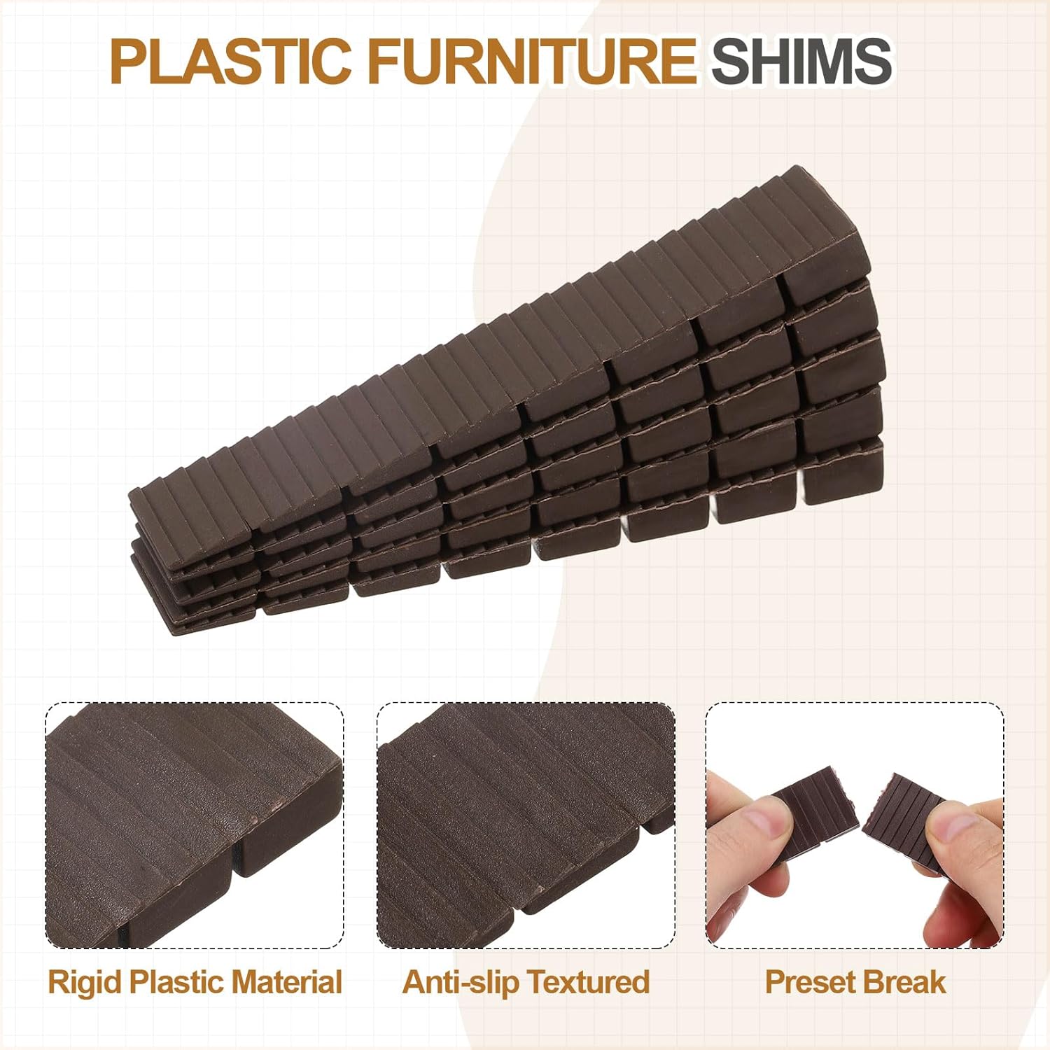 Description : Material: These furniture levelers are made of rigid plastic, moisture-proof, able to withstand various weather conditions, and resistant to heavy pressure. They can be used for heavy furniture leveling and ensure long-lasting performance.Anti-Slip Design: The textured surface design of the wedges shim levelers help stabilize and level various objects, while the grooved bottom provides strong grip, firmly securing furniture, preventing slippage or displacement, and keeping the furniture stable.Easy to Use: The table wedge can be broken off into any section according to the required height and length, and then placed under the furniture you want to level. If the gap is too large, you can use two or three stacked together (Please measure the door gap size before use).Wide Application: These wedges shims for leveling can be used to level various types of furniture, such as bookcases, toilets, tables, doors and windows, bathroom fixtures, chairs, cabinets, sheds, patios, and mailboxes, minimizing visible unevenness and maintaining the aesthetics of your home.Specifications:Material: PlasticColor: BlackTotal Size: 100mm x 19.8mm / 3.94" x 0.78" (L*W)Height Adjustment Range: 1mm-8mm / 0.04"-0.31"Package Content: 12Pcs x Plastic Furniture Shims