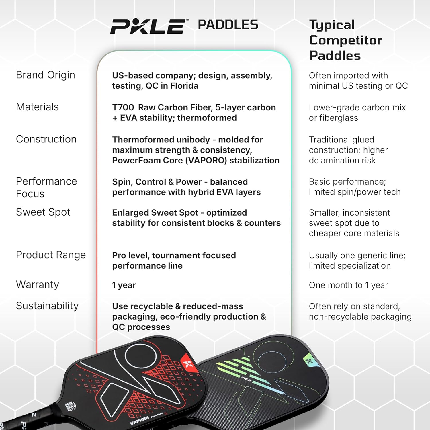 | Warranty Description | A 1 year limited warranty covers PKLE Paddles against manufacturer defects. |
