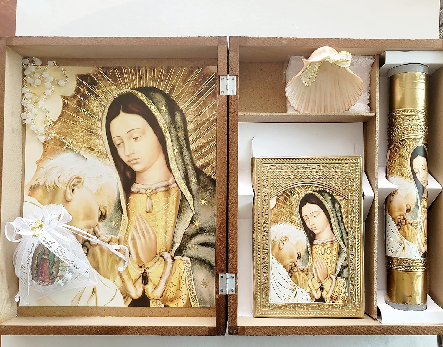 | Additional Features | Religious Themed Candle Set with Spanish Bible, Organzas, and Rosaries in Elegant Wooden Box |