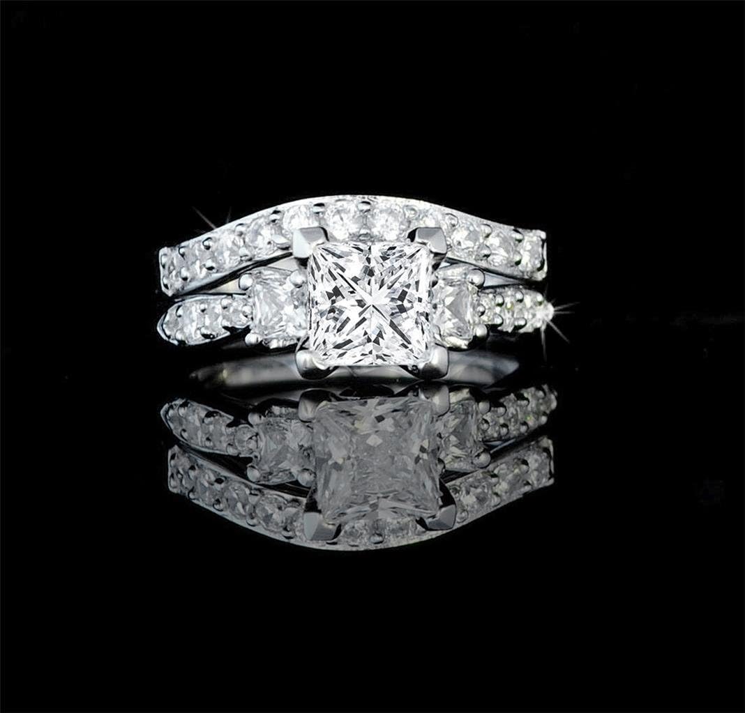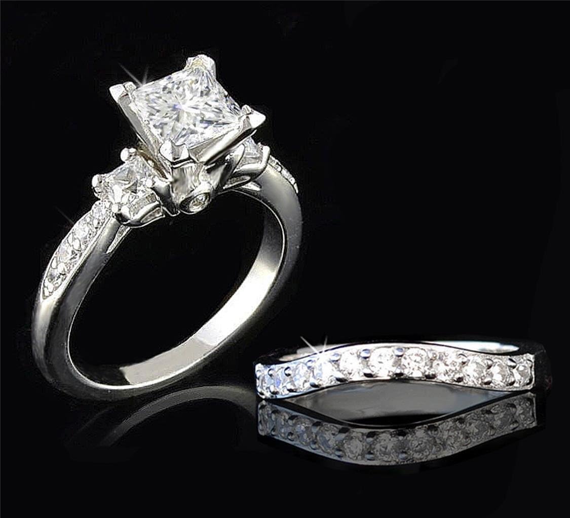 This is an exquisite designer 3 stones princess cut simulated diamond ring band set. Center stone is a brilliant 1carat ( 6x6mm ) simulated diamond with two 4x4mm side stones. The Princess cut is the second most popular cut shape for diamonds. With more chevrons and precise symmetry, our signature Star Cross Princess Cut diamond simulant is able to return more light, and hence is full of fire and brilliance.