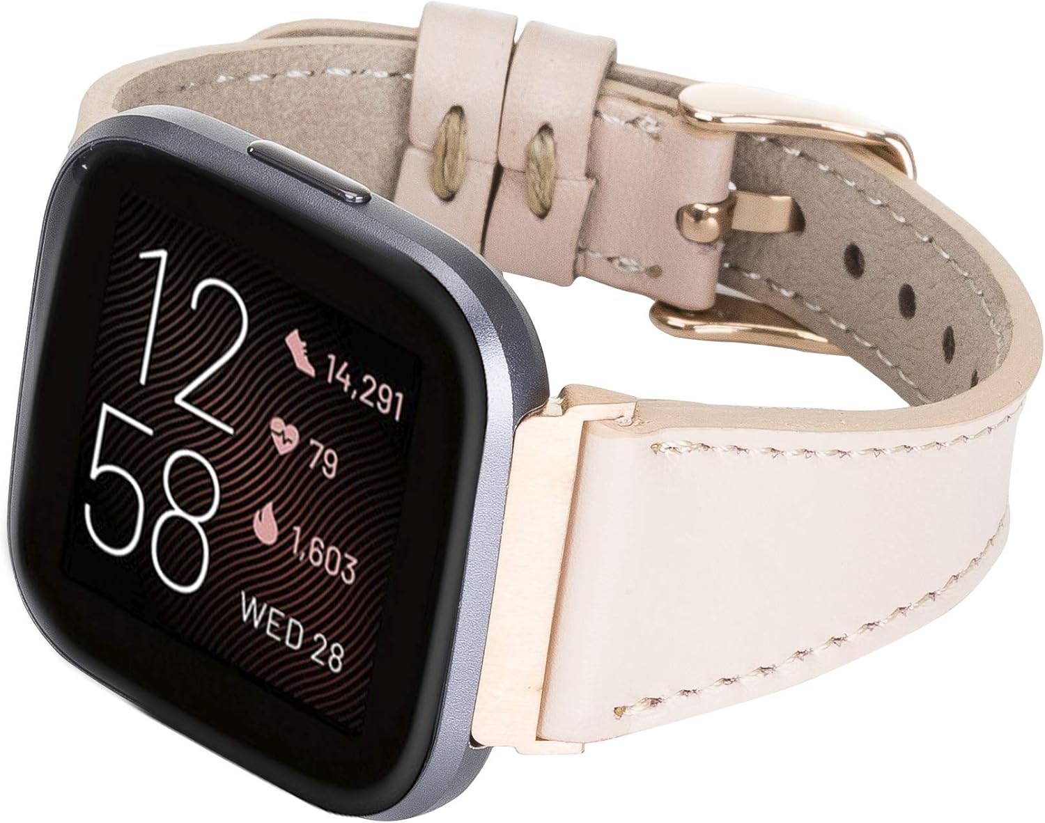 This Slim Leather Watch Band is Compatible with Fitbit Versa and Fitbit Versa 2Wide range of color optionsChoose from Silver, Black, Gold, or Rose Gold stainless steel hardware.Aged by your individual lifestyle - sourced from top-class tanneries in Italy and Turkey, the Vintage Venito will come to life as the leather ages over time, creating a patina unique to youHandcrafted from soft full grain genuine leather with a unique texture, this luxurious accessory boasts a simple, classic buckle closure, making it super comfortable and adjustableStitched to perfection with a stronger suture, each strap is reinforced with durable linen thread and a soft leather backingQuick and easy installation. Slid in - Slid out installation. No additional tool is requiredThis is a unique and very special item. An exceptional timeless gift for men and women smartwatch lovers.Coming in an elegant package, a perfect gift for Mother’s Day, Valentine’s Day, Father’s Day, Anniversary, Graduation, and BirthdayPLEASE FEEL FREE TO CONTACT US IF YOU HAVE ANY QUESTIONS BEFORE YOU ORDER OR AFTER YOU PURCHASE. WE’LL TRY TO ADDRESS ALL YOUR QUESTIONS OR COMMENTS IN A TIMELY MANNERALL OUR PRODUCTS ARE SUBJECTED TO QUALITY CONTROL BEFORE THEY ARE PACKED. HOWEVER, IF YOU NOTICE ANY ISSUE PLEASE LET US KNOW FIRST