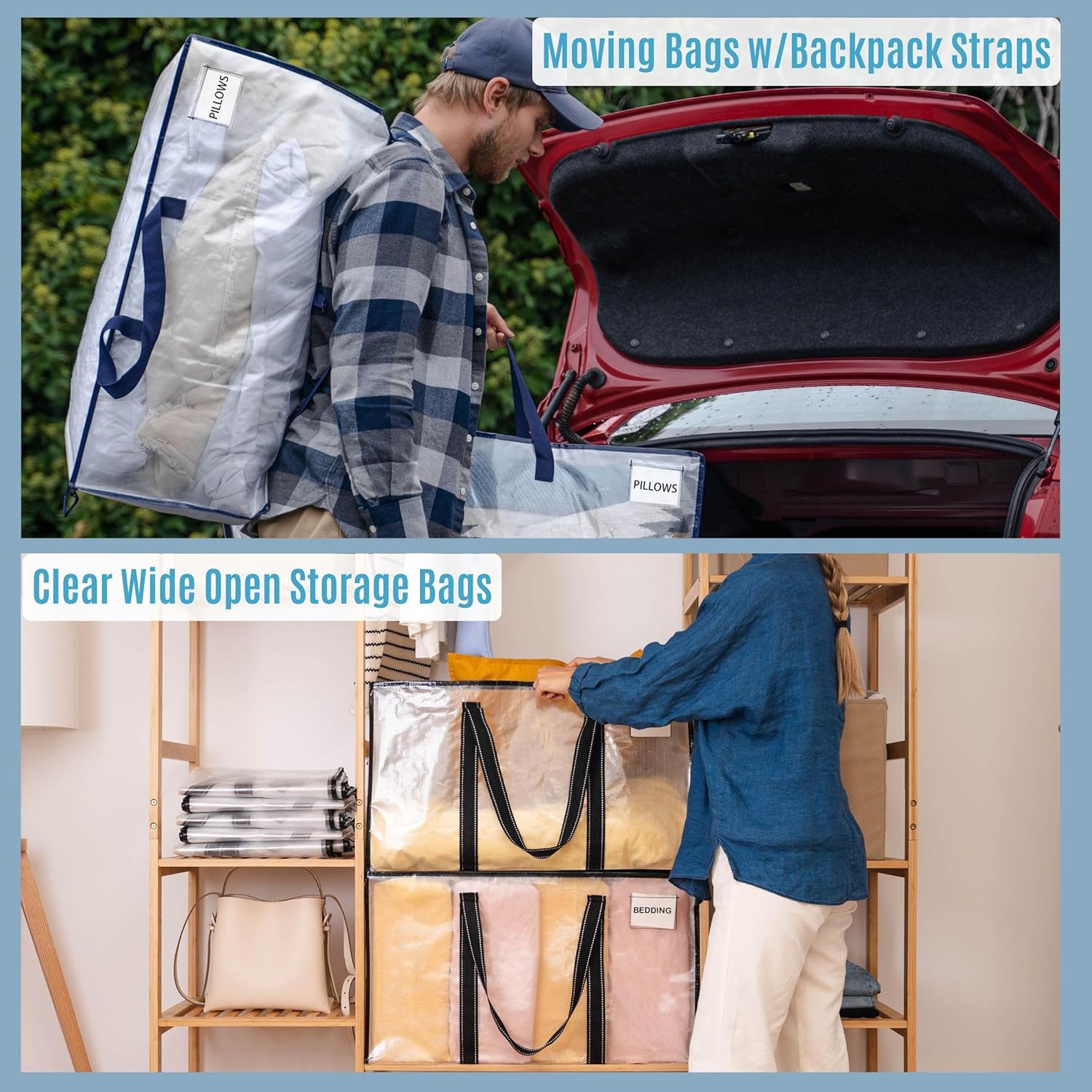 Experience a hassle-free move and storage solution with VENO's strong and spacious heavy-duty moving bags. This set includes 6 moving bags with backpack straps, allowing you to carry heavy loads effortlessly and conveniently, as well as 4 clear wide open storage bags. Perfect for storing bedding, comforters, Christmas decorations, pillows, blankets, throws, and more. These bags ensure quick and organized access, whether during the holidays or in everyday life.