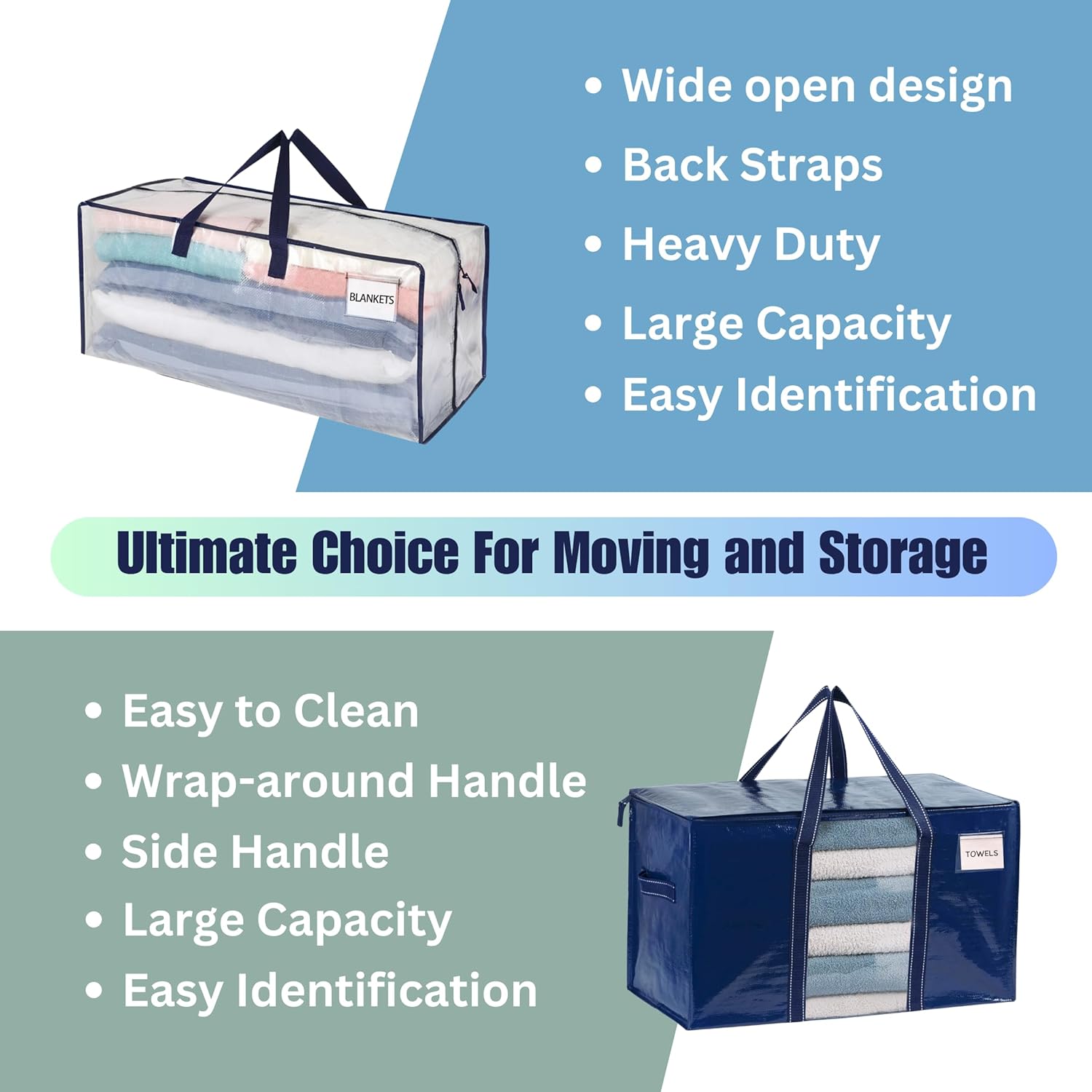 VENO Environmental Commitment: It is our mission and commitment to reduce our impact on the environment in order to make a cleaner, more livable future. Our high-quality, sustainable products are manufactured by maximizing the use of post-consumer resources which saves plastic from ending up in oceans, lakes, and landfills. Made for the shopper with a soft spot for our planet who enjoys having convenient, functional, and stylish products in their arsenal. Please use as much as possible to help protect our environment.The Strongest Moving Products: VENO Storage Moving Bags are incredibly durable. Products are made from high-grade polypropylene woven material, contain reinforced poly webbing handles for heavy-duty use, and include a premium dual tab zipper. Move easier with our strong and sturdy products that are the perfect moving box alternative!Extremely Versatile: VENO Moving and Storage Bags are multi-functional and can be used for different purposes such as moving, storing, organizing, transporting, traveling, or camping. They are a fantastic alternative to traditional laundry baskets and ideal for college students, families, and frequent travelers. Make your life easier with our products that are lightweight, water-resistant, easy to clean, and foldable for easy compact storage.What You Get:8 x VENO Storage Moving Bag with Backpack Straps (Clear)4 x VENO Extra Large Moving Bags with Window (Blue)3 Month Warranty: Our unique and classic bags come with a 90-day warranty. Contact us for any problem and we will ship a new bag FREE of charge or provide you a better solution. Customers are our top priority. If you are not happy, we are not happy!