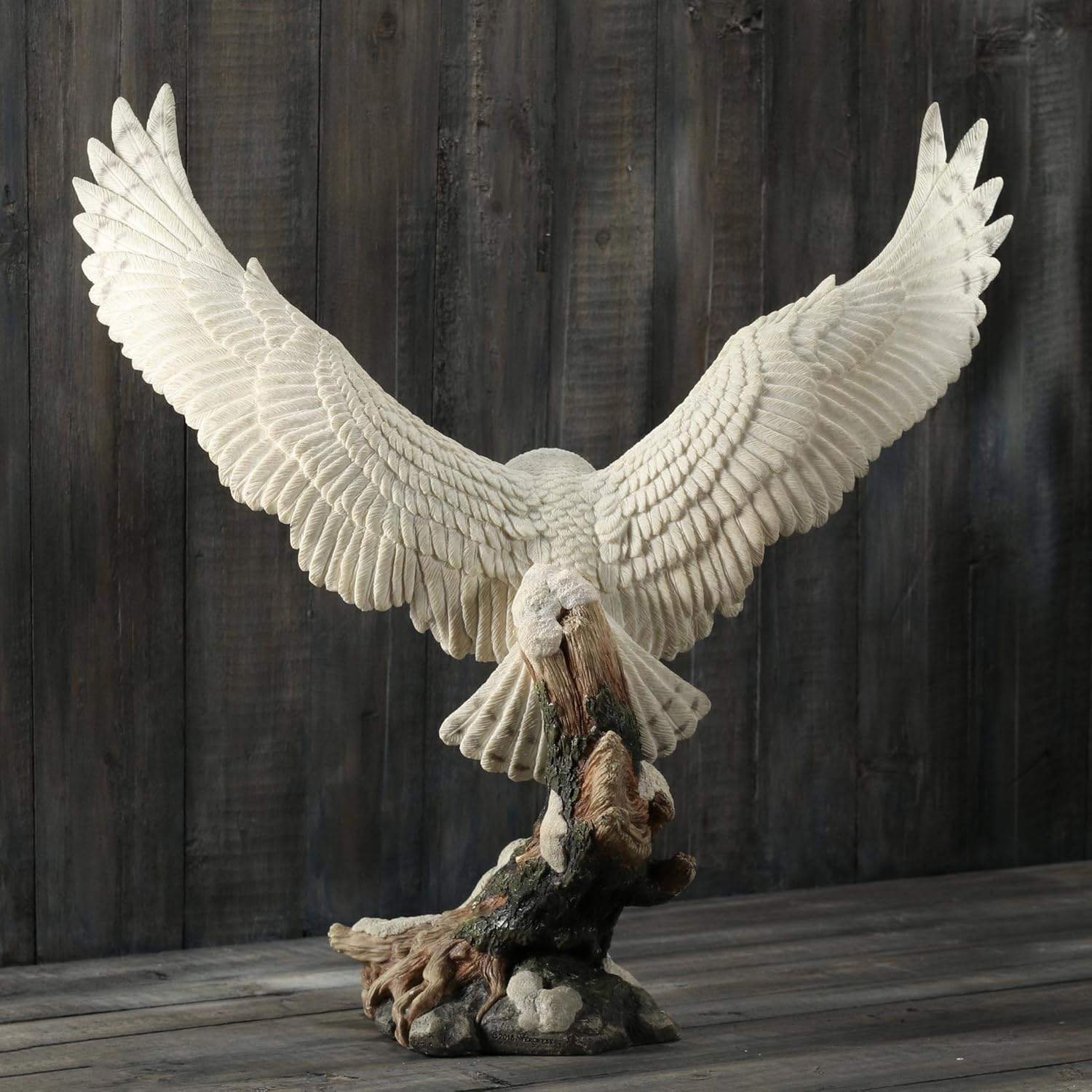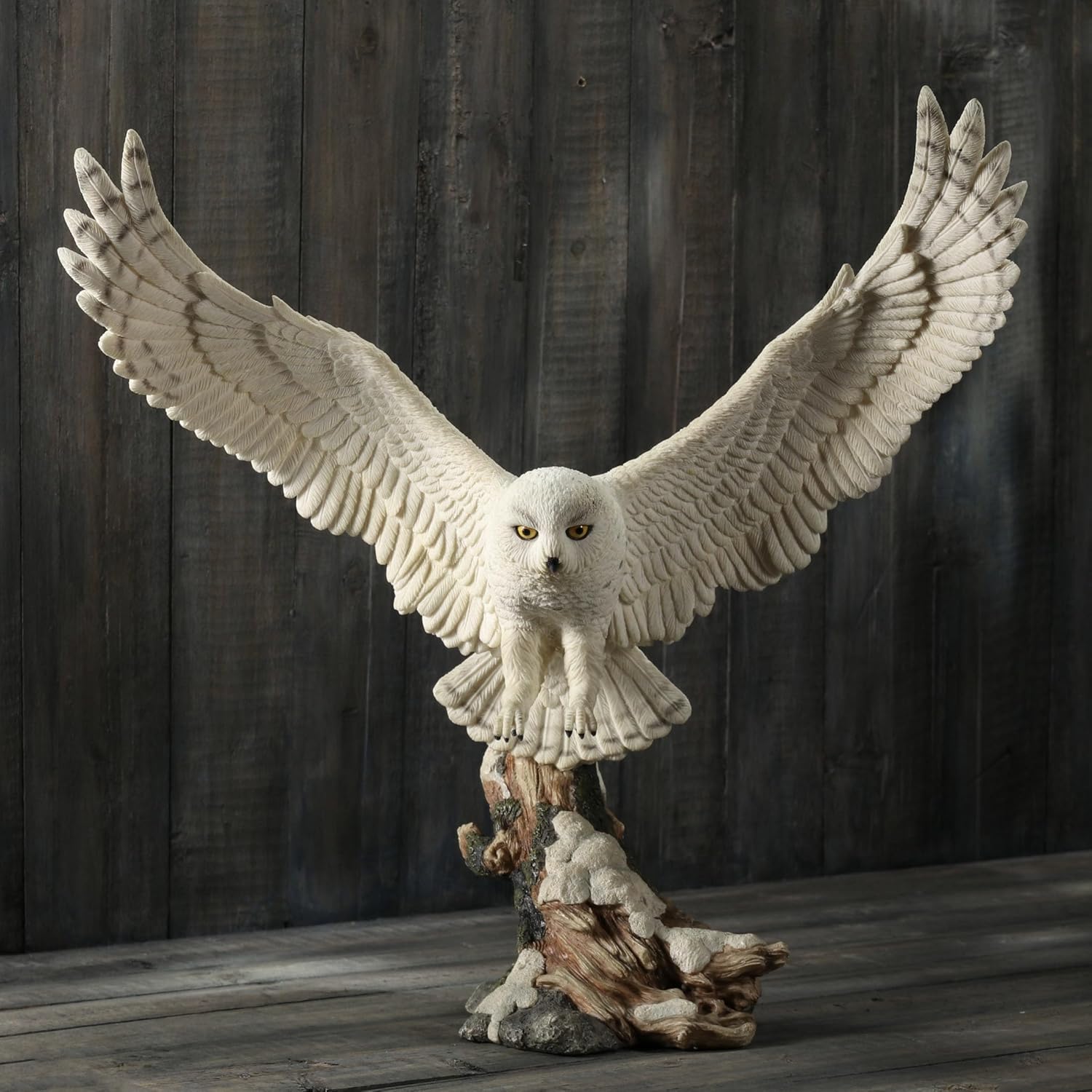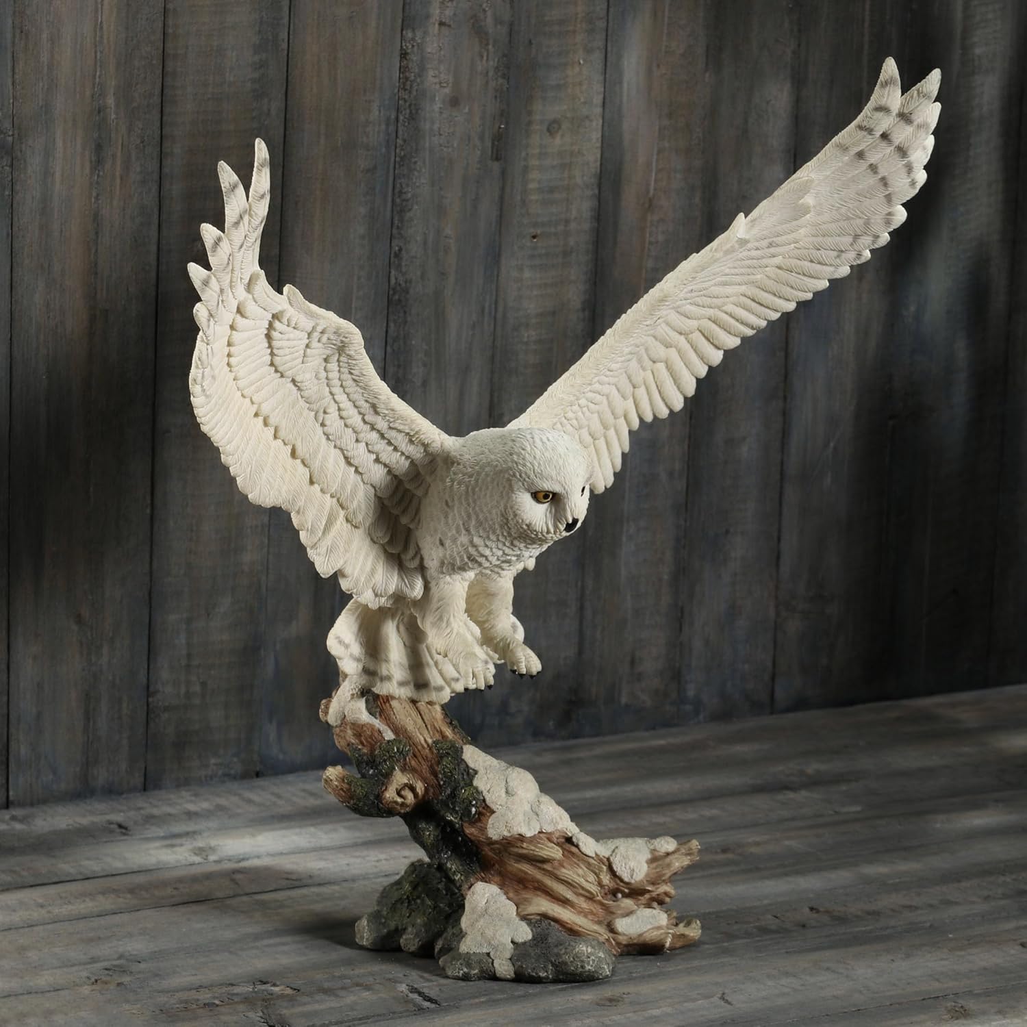 Beautiful and mystical, the snowy owl embodies the essence of true wisdom, soaring high above the earth where it can see all that others cannot. This majestic bird has just ascended from its perch on a snow covered old tree branch as if it's spotted some prey. This incredible work of art beautifully captures the majestic spirit of the snowy owl in stunning detail. Though it's sculpted in cast resin, the detail of the individual feathers and piercing black and yellow eyes give it a lifelike quality in a design that creates movement and realism you'll take pride in displaying in your home. This 13.5 inch high, 13.25 inch long, 5.5 inch wide owl statue is sure to make any owl lover hoot with excitement.