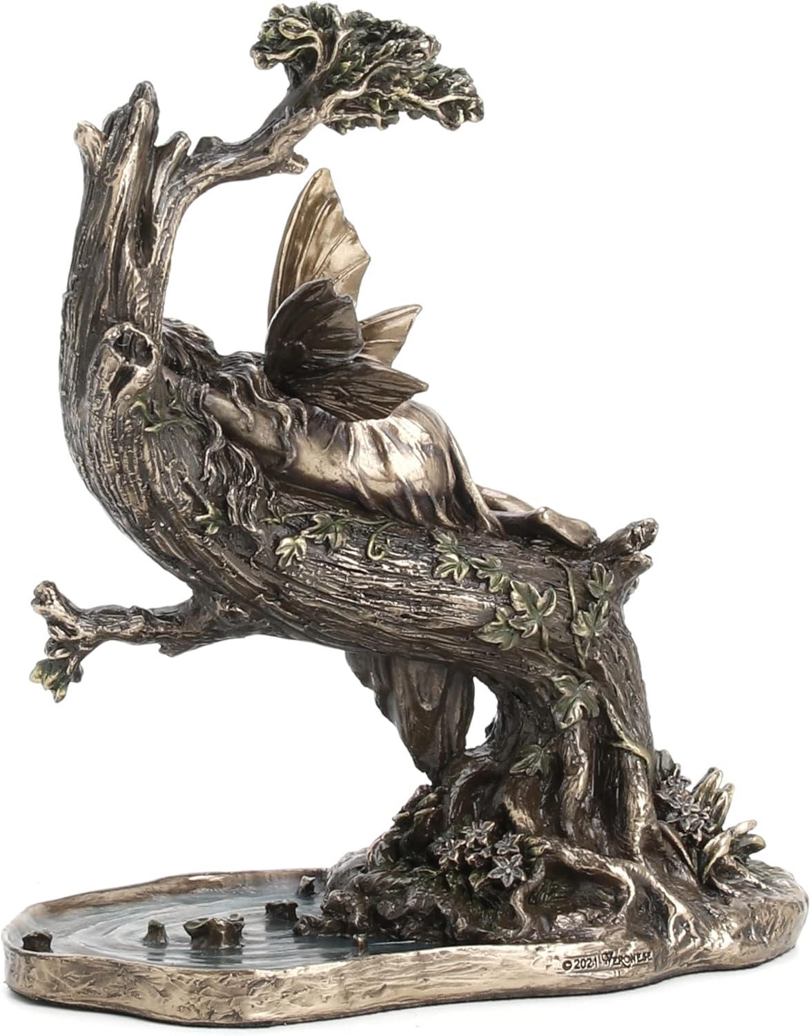 Beautiful fairy having her little nap time on a tree next to a small pond, made using high quality designer resin and cold cast bronze technique.