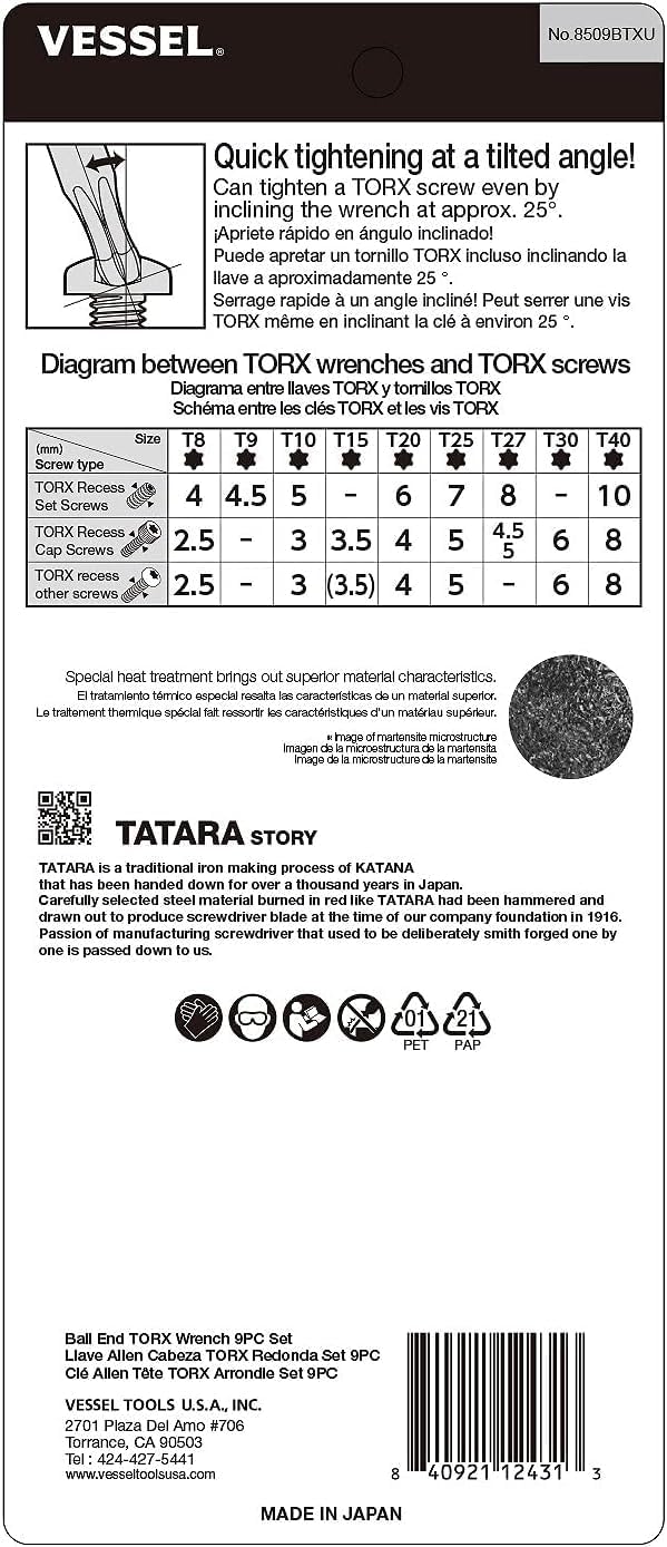 VESSEL Ball End TORX L-Key Wrench 9PC. Set No.8509BTXU 8509BTXU