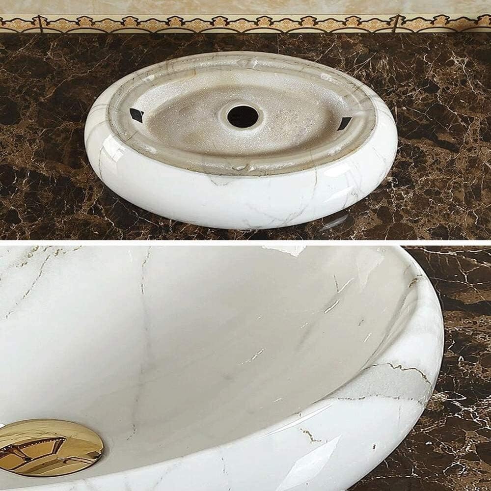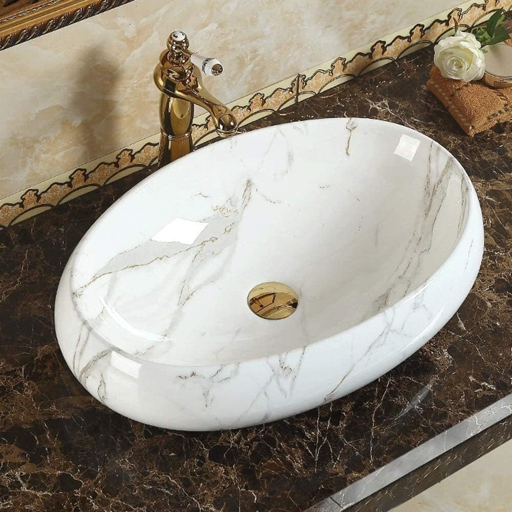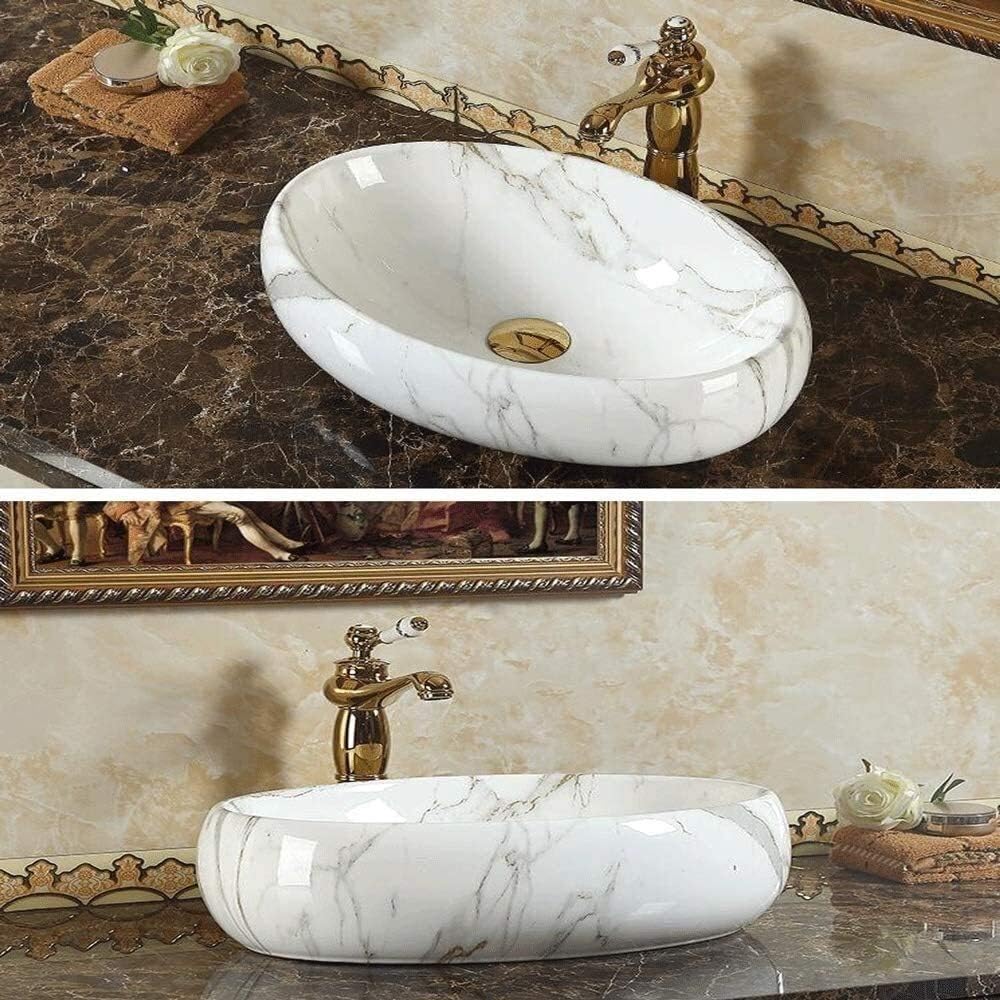 Vessel Sink Wash Basin Sink Floor Standing Specification: Product type:Vessel Sink Material: Ceramic Color: white marble pattern Shape: oval Sink dimension: 18.7"L x 13.38"W x 5.7"H Faucet height: 12.79" Installation type: above the counter Overflow: none Features: Made of high quality ceramic Elegant &fashionable design Easy-to-Clean Surface Resistant to household temperature changes Ceramic smooth surface prevents from discoloration and fading. Free faucet and Pop-up drain are all included Package Included: 1x Vessel Sink 1x Pop up drain 1x drain pipe 1x mounting ring 1x Installation Manual