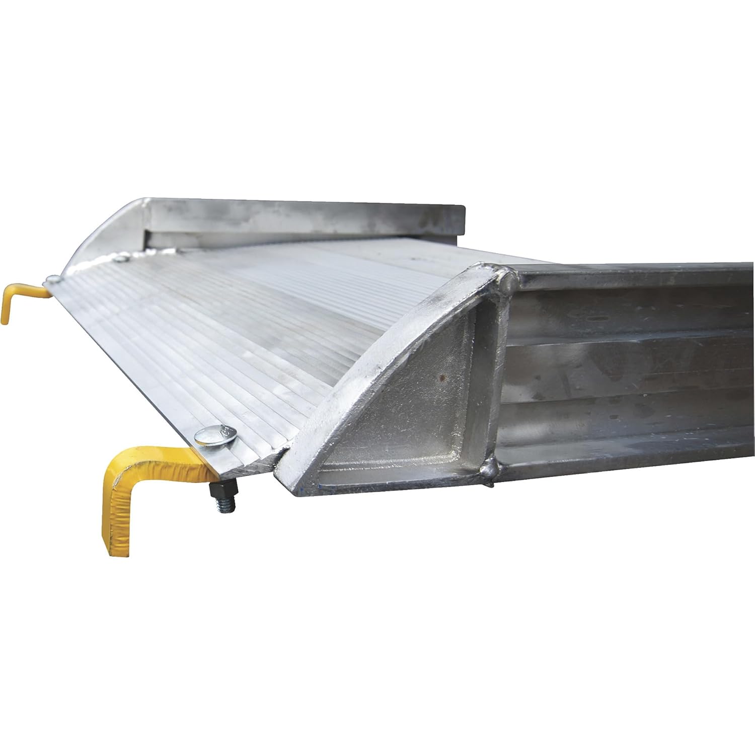 The Aluminum Walk Ramp enables delivery men/women, shippers, and receivers to load and unload trucks when docks are unavailable. Heavy-duty steel chains with steel grab hooks are attaches to each side of ramp for safely securing ramp to truck. Constructed of strong aluminum alloy with non-skid tread surface. The ramp is lightweight and easy to handle. This steel hook style mounts onto the truck extensions.