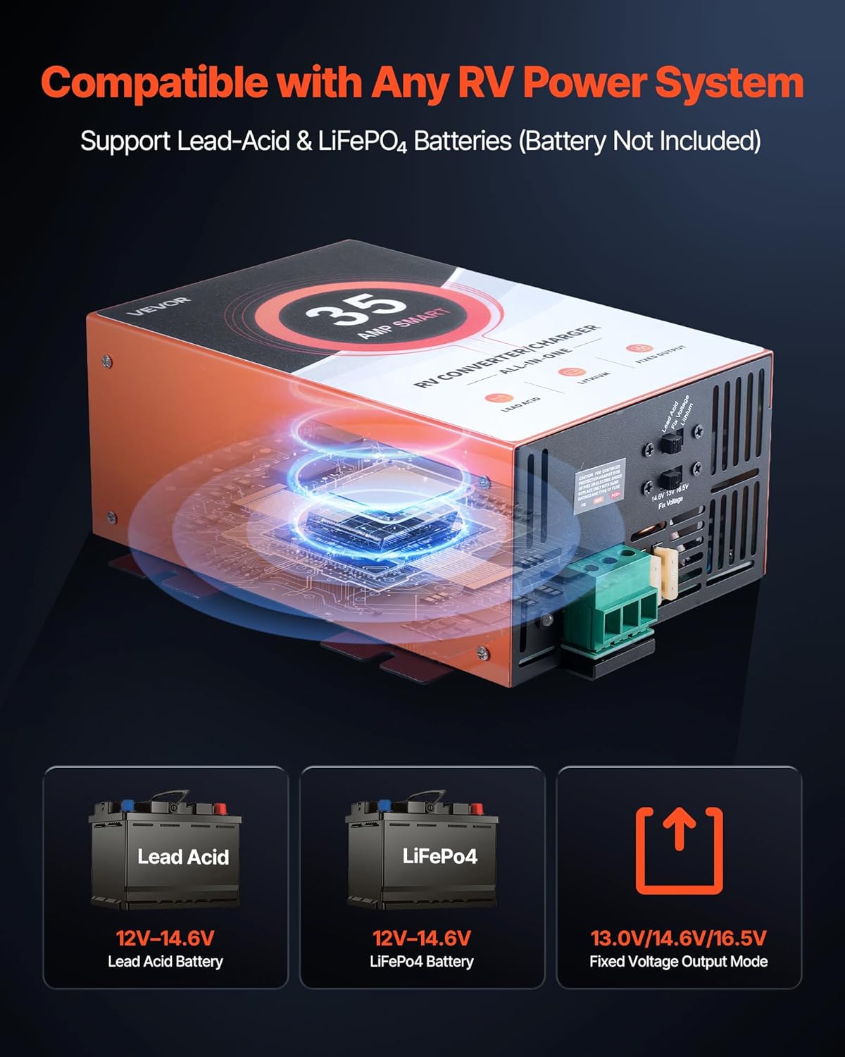 | Item Type Name | RV Power Converter, 35 Amp, 110V AC to 12V DC RV Converter Battery Charger, 4 Stage Smart Charging, 13V to 16.5V Operating Range, Compatible with Lithium Lead Acid Battery, for Camper Trailer |