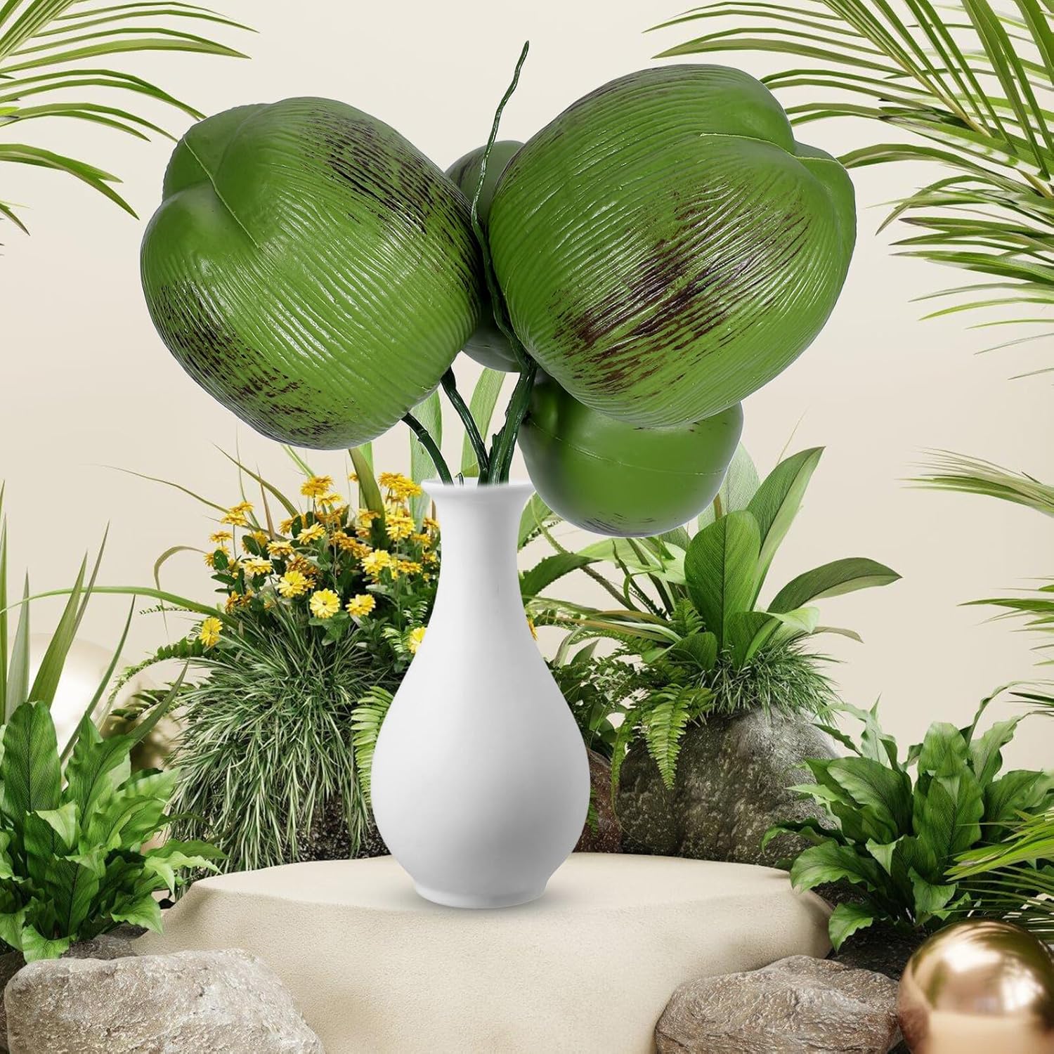 Package List 1 x simulated coconut fruit Features -Color:Green -Product Info:Simulated coconut fruit -Portable and easy to use: lightweight and easy to handle, this artificial coconut can be effortlessly transported and arranged to suit your needs fruit hanging decorations -Ideal for various events: suitable for hawaiian parties, beach weddings, and home decor, this artificial coconut bring a touch of tropics to any occasion beach decor -Lifelike detail: each artificial coconut is crafted with attention to detail, offering a realistic appearance that enhances any tropical themed event luau photo booth props -Sturdy materials: made from plastic and iron wire, this artificial coconut is designed for durability and long term use -Material:Plastic, iron -Enhances decor: adds a vibrant touch to your space, nice for creating a tropical and relaxing atmosphere in homes, offices, and gardens hawaii party decorations -Size:38.00X35.00X33.00cm/14.93X13.76X12.97inGoods Informationfruit themed party supplies This artificial coconut is nice for indoor and outdoor use, making it a great addition to any party setting.hawaiian themed party decorations Their sturdy construction ensures this fake coconut can withstand various weather conditions, allowing you to create a tropical atmosphere no matter where your celebration takes place