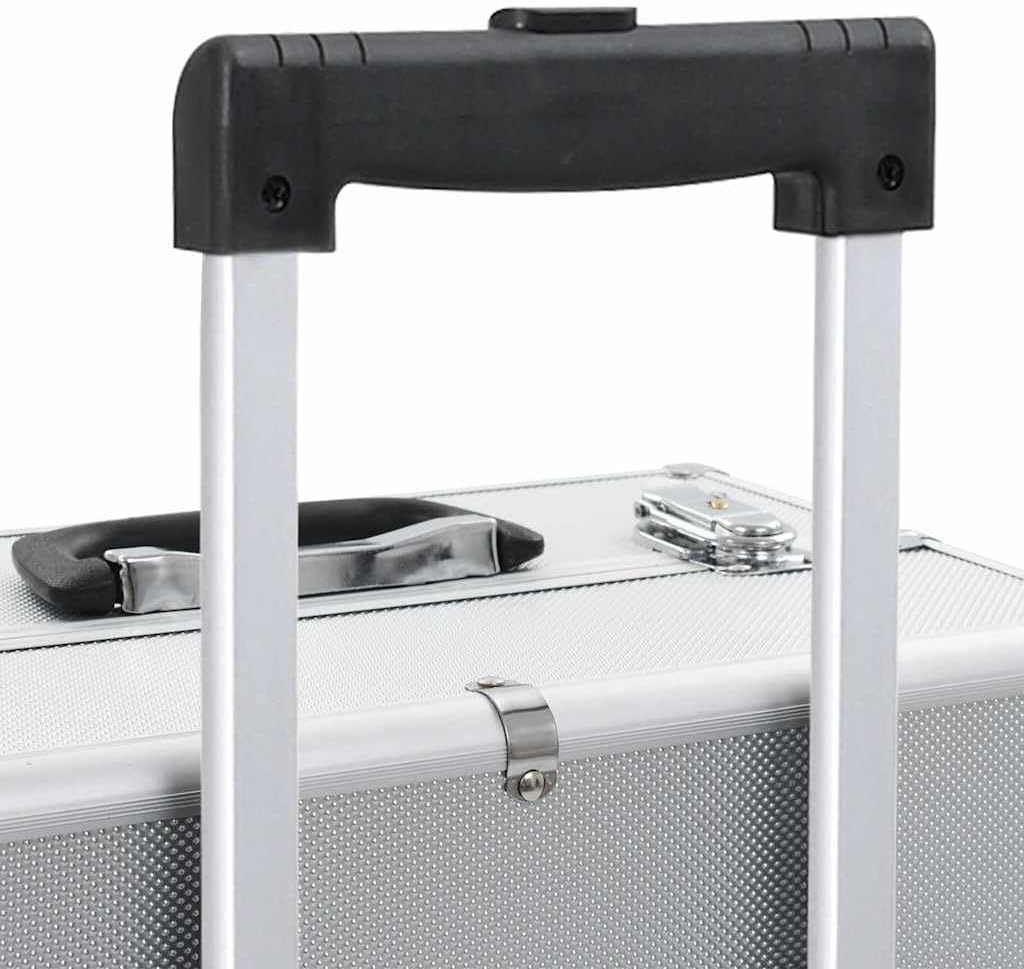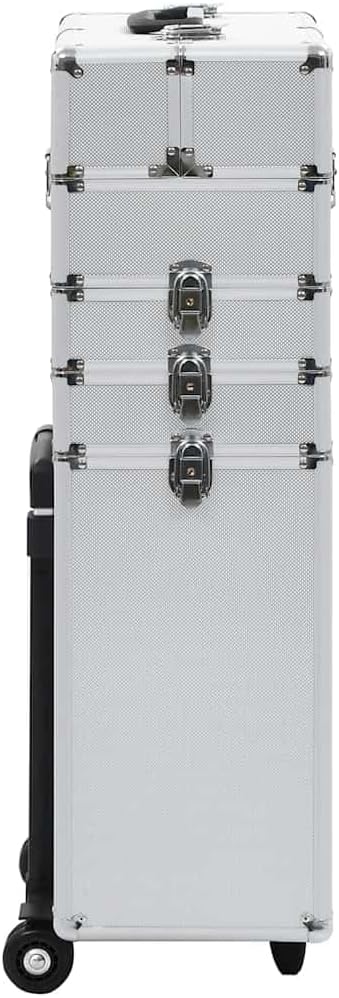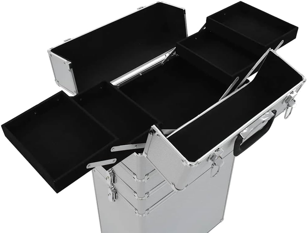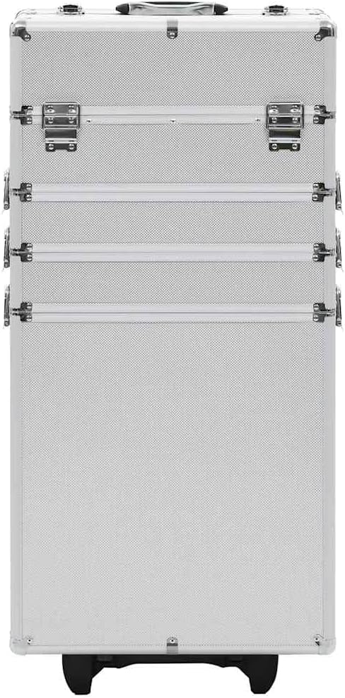 Our make-up trolley is the ideal solution for keeping your cosmetics neatly organized. Simply pack everything you need in this practical beauty case and take it with you!Made of wood, ABS sheeting and aluminum, this make-up trolley will easily store your cosmetics and keep them in perfect condition. This makeup suitcase features 4 tiers and extendable trays in top case, providing ample storage space for your cosmetics and beauty products. It features 4 detachable casters, which make it easy to move around and take it with you everywhere you go!Color: SilverMaterial: Aluminum, ABS and woodDimensions: 14.6" x 8.7" x 30.7" (L x W x H)With 4 tiers and extendable trays in top caseWith 4 detachable casters