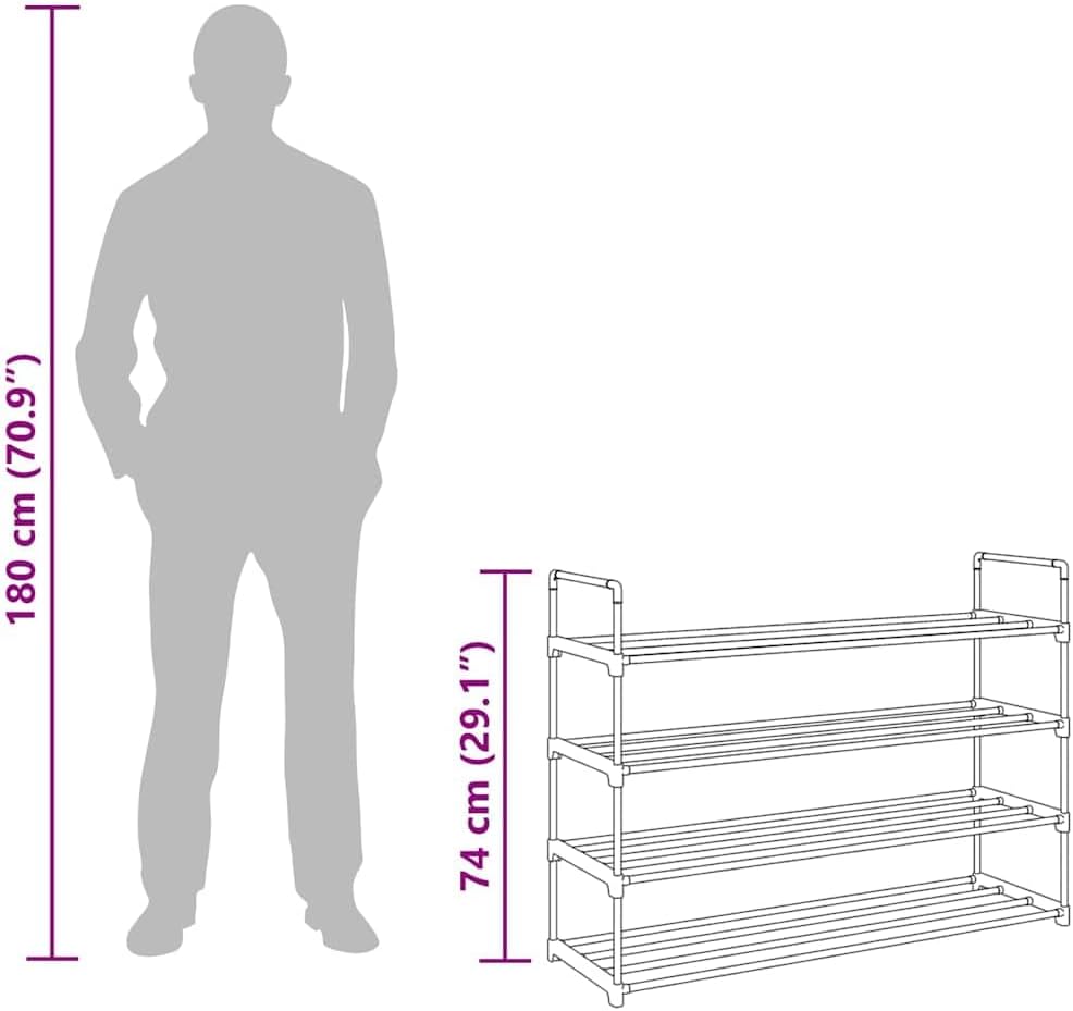 This shoe rack is a sleek and modern way to store your shoes, combining style with practicality. Perfect for hallways or bedrooms, it not only keeps your shoes organized but also adds some elegance to your space.Perfect design for keeping your shoes tidy and easy to reach.Four solid shelves provide plenty of space for shoes.Made from metal and plastic for a sturdy, long-lasting product.Its minimalist style fits in with any decor and keeps things looking clean.Quick to put together and lightweight for easy moving.Color: Black Shape: RectangularIndoor/Outdoor: Indoor OnlyCover Included: NoRoom: HallwayCapacity: Holds multiple pairs of shoesDimensions: 11.4 x 35.8 x 29.1 in (W x L x H)Weight: 3.57 lbsLadder: NoBrand: vidaXLDelivery Contains: Shoe rack parts and assembly instructionsAssembly Required: YesSKU: 245626EAN: 8718475583424