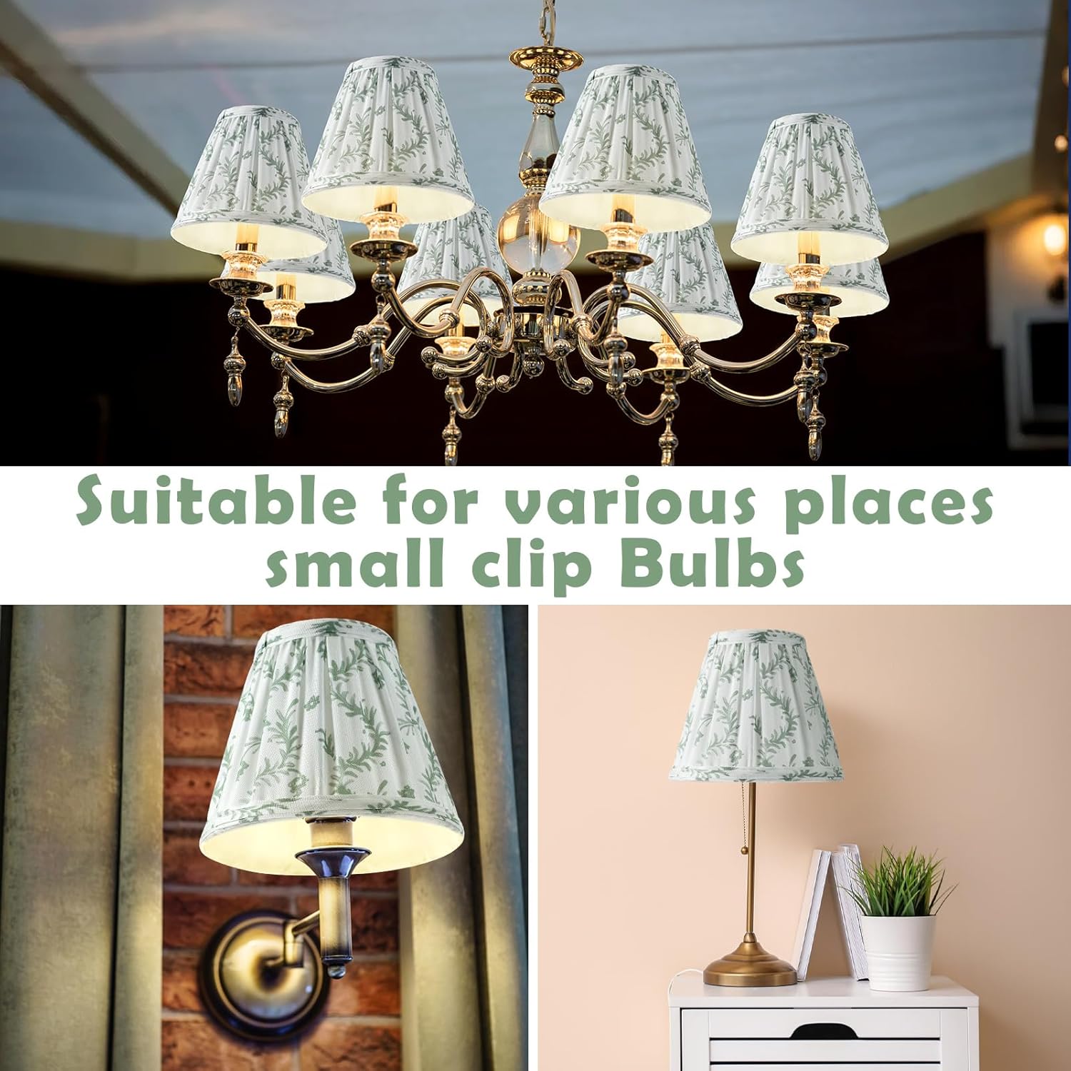 Features: Experience the mark of thoughtful craftsmanship with our pleated lamp shades. Each piece is meticulously hand-assembled by skilled artisans, ensuring attention to detail that is evident in the consistent stitching and crisp pleats. Transform the quality of light in your room with our elegantly pleated shades. The soft fabric works as a diffuser, gently scattering the bulb's glow to minimize harsh shadows and create a uniformly warm, inviting radiance. Specifications: Material: main fabric and metal Color: main white and green Size: approx. 3 x 5.5 x 4.7 inches/ 7.6 x 14 x 12 cm Package includes: 6 x Pleated Chandelier Lamp Shades Notes: Manual measurement, please allow slight errors on size. The color may exist a slight difference due to different screen displays