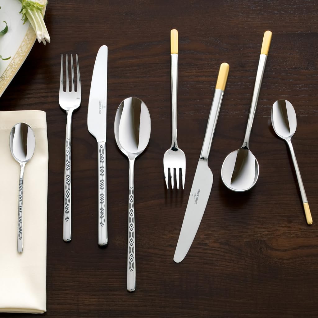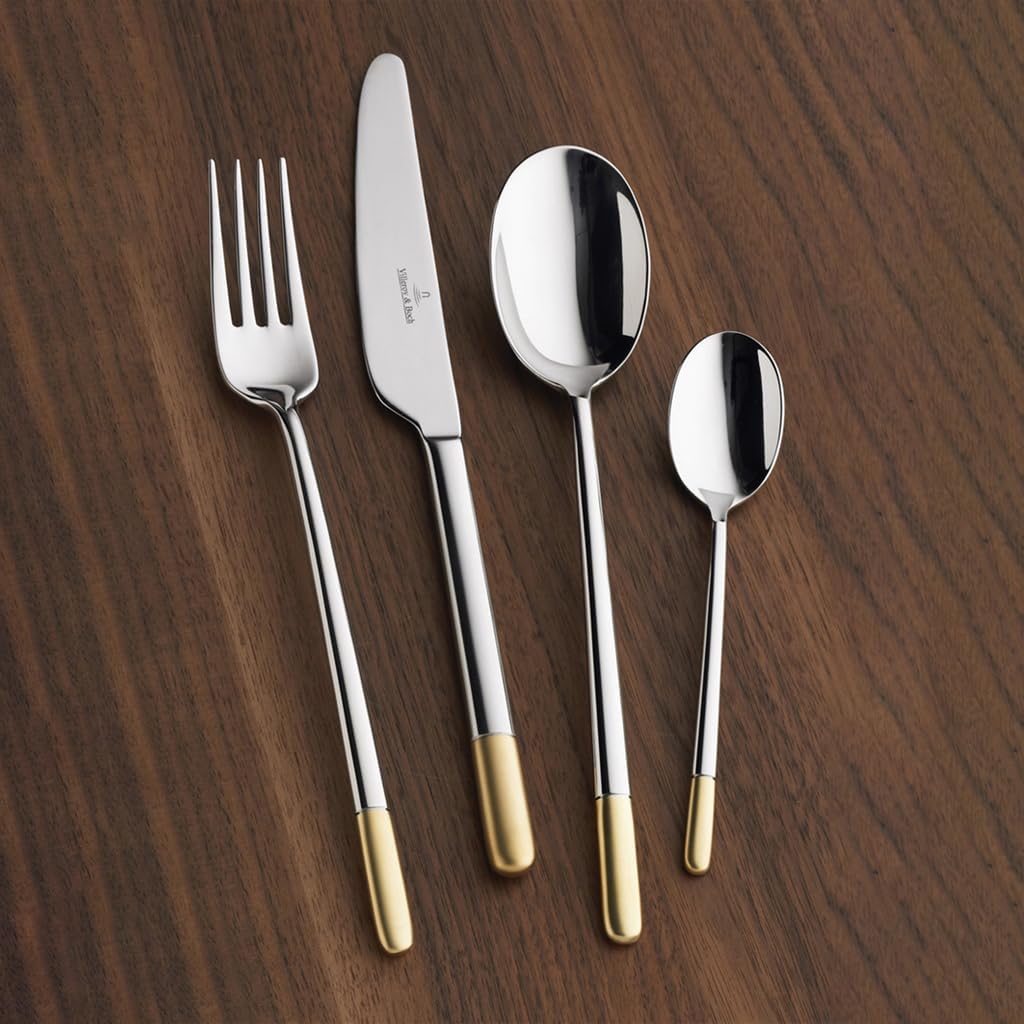 Country of Origin: Vietnam. Ella Gold has an elegant slender silhouette and the long handle is slightly curved and calculated to fit in your hand. All surfaces excluding the end of the handle, are polished and filled with fine gold under delicate decorative lines for a superior design feature. Velvety matte gold color contrasts with polished stainless steel It is delicate, yet has a strong gold impression, and it is great for creating a luxurious dining table in an instant. The size is slightly smaller than the dinner size and is useful for breakfast and desserts.