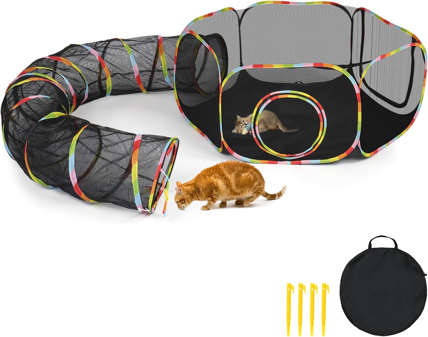 Treat your indoor furry friends to a secure and thrilling “outdoor-like” escapade right at hand with our 5 way collapsible tunnel. This adaptable tunnel for cats comes equipped with three distinct tents and two tunnels, opening up a world of boundless amusement and discovery. Constructed from tough, breathable mesh and robust oxford fabric, our outdoor enclosure is a good choice for both indoor coziness and outdoor adventures. This furry fun zone guarantees your pets stay engaged and protected.Specifications:1. Dome Tent Dimensions: (59.8 x 59.8 x 42.5) in / (152 x 152 x 108) cm2. Square Tent Dimensions: (27.6 x 27.6 x 27.6) in / (70 x 70 x 70) cm3. Tunnel Dimensions (Each): (16.5 x 47.2) in / (42 x 120) cm4. Hexagonal Tent Dimensions: (47.2 x 47.2 x 22.8) in / (120 x 120 x 58) cm5. Material: 210D Oxford FabricPackage Includes:1 x Dome Tent1 x Square Tent1 x Hexagonal Tent2 x Tunnels