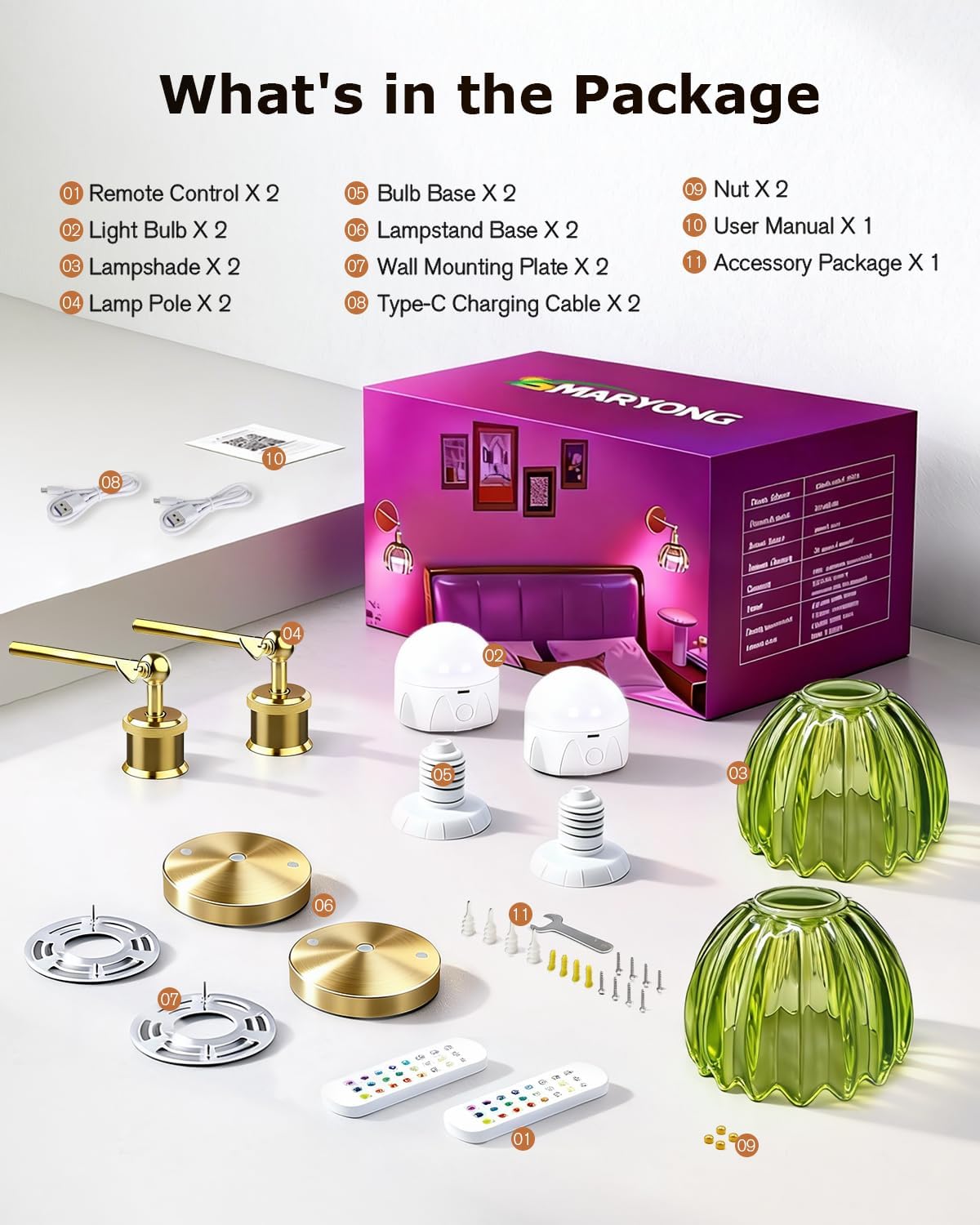 | Included Components | Bulb*2, Metal lamp holder*2, Glass lampshade*2, Set of screws*2, Remote control*2 |