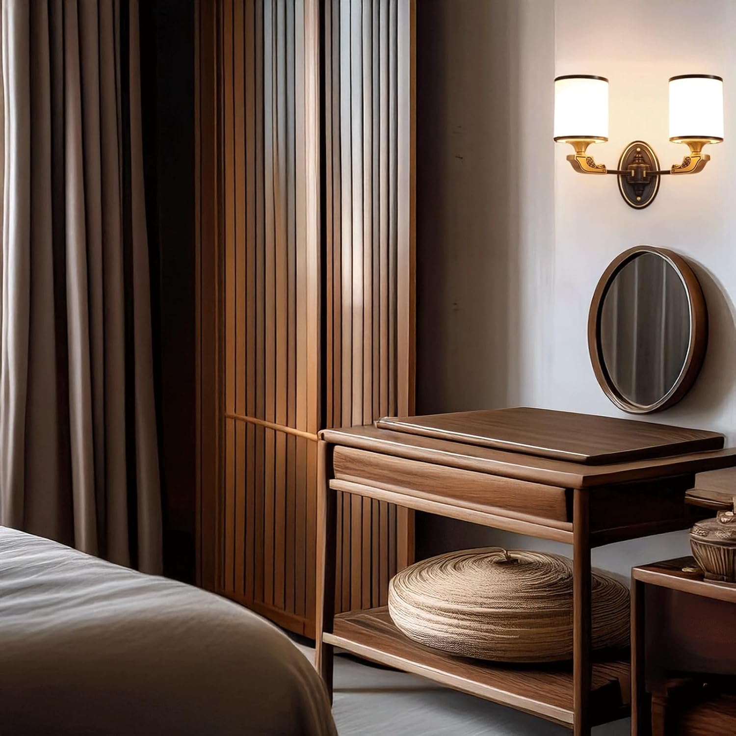 Product Parameters:Type: Wall Sconce / Wall Lamp (Two-Light)Style: Vintage, Traditional, European, Classic, Transitional, Decorative, Ambient Lighting, Bathroom VanityMaterial: Metal (black oval backplate with gold trim, brass-tone arms with carved details), Glass (white cylindrical shades with black trim)Color: Black (backplate), Brass Tone (arms), White (shades)Dimensions:Overall Width: 15.0" (38cm)Overall Height: 12.6" (32cm)Depth: 11.0" (28cm)Backplate Height: 7.1" (18cm)Backplate Width: 4.7" (12cm)Shade Diameter: 5.1" (13cm)Shade Height: 5.9" (15cm)Socket Type: E27Number of Bulbs: 2Bulb Included: NoOptimized Special Feature: This vintage-inspired 2-light wall sconce offers a blend of classic elegance and functional design. It features an oval black metal backplate with subtle gold accents, from which two decorative brass-tone arms extend, adorned with intricate carved details. Each arm supports a sophisticated white cylindrical glass shade with a contrasting black trim, designed to accommodate one E27 bulb (not included). The dual lights cast a balanced and diffused illumination, making it a versatile and decorative light source, ideal for bathroom vanities, hallways, living rooms, or bedrooms, enhancing a vintage, traditional, or European classic inspired décor.Applicable Space: Ideal for Bathroom Vanity Lighting, Hallway, Entryway, Living Room Accent, Bedroom Bedside, Dining Nook, Office, Hotel Room, or other spaces desiring vintage decorative lighting.