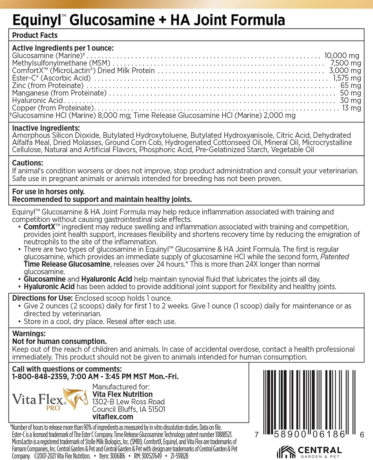 Vita Flex Pro Equinyl Glucosamine + HA provides a concentrated horse joint supplement formula for maximum performance demands. Vita Flex Equinyl Glucosamine with Hyaluronic Acid contains twice the Glucosamine of the Equinyl Combo and does not contain Chondroitin Sulfate. It also features MSM, Ester C*, Zinc, Hyaluronic Acid, Manganese and Copper along with Comfort X Microlactin , a unique ingredient that may reduce inflammation associated with training and competition without causing gastrointestinal side effects. This formula contains 10,000 mg of marine glucosamine, including 8,000 mg of immediate release glucosamine HCl plus 2,000 mg of Patented time released glucosamine. Hyaluronic acid is included to provide additional joint support for flexibility and healthy joints.
