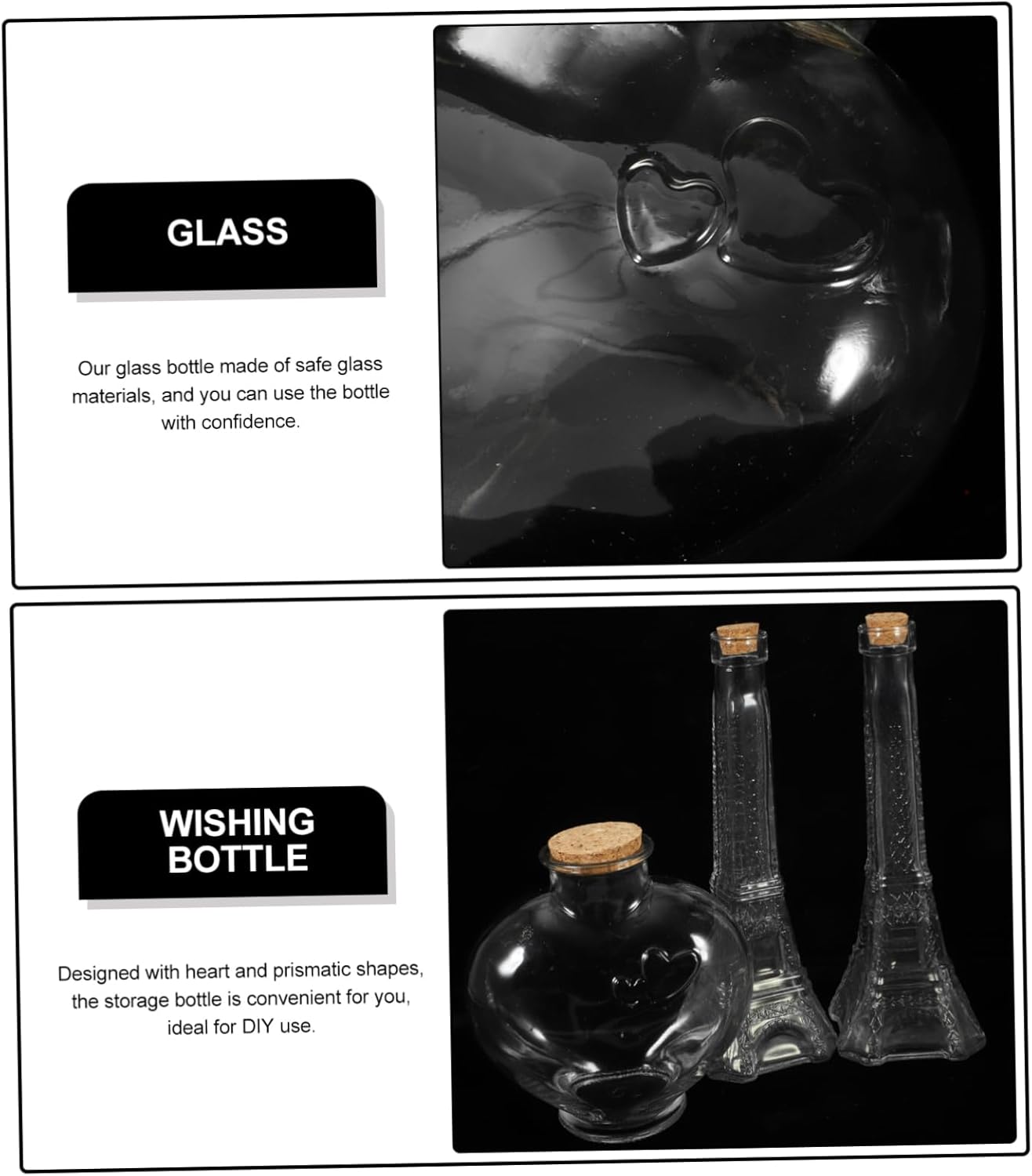 Package Include 1 x Heart Shape Bottle 2 Shape Bottles Features -Material:Glass glass bottle -Size:15.00X13.50X7.00cm/5.89X5.31X2.75in small glass bottle -Color:Transparent small glass bottles -Size:23.50X8.00X8.00cm/9.24X3.14X3.14in wedding glass bottle - The small storage bottle can be used as a bottle for storing wish messages, wedding sand, small or other small objects creative bottle. - Your friends or family members will be happy to receive this practical bottle because they are multi-functional decorative bottles heart. - Glass bottle with stopper is made of glass materials and can be used for a long time transparent glass bottle. - Small size, weight, this glass bottle is easy to carry and storage, will not take up of space glass drift bottle. - The glass bottle has a transparent and tower and heart shape design, which is convenient to carry and easy to use bottles adornment.Goods Descriptionheart-shaped glass jar It is made with craftsmanship, will not be easily damaged, and will bring you a better experience.glass bottle This is made of to make bottle ornaments.transparent drift bottle It has reasonable design and practical functions, which can meet your daily decoration needs and bring you a better experience