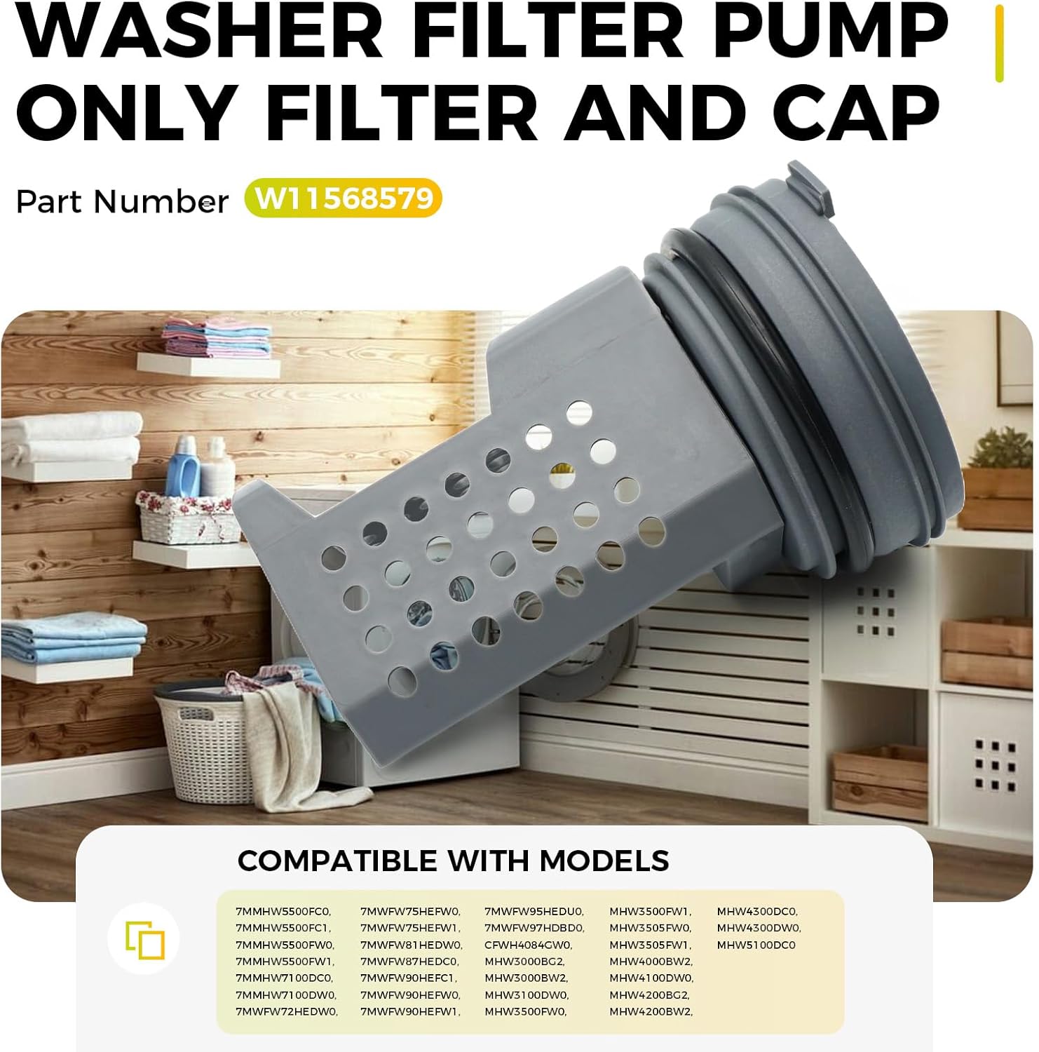 Upgrade the performance of your washing machine with the W11568579 + W10365897 Washer Filter Pump, Only Filter and Cap, designed for reliable compatibility and long-lasting durability. Washing machine water filter pump is compatible with for Maytag, Whirlpool, Amana, Crosley, and Kenmore front load washer models, including popular series such as 7MMHW5500FC0, 7MMHW5500FC1, 7MMHW5500FW0, 7MMHW5500FW1, 7MMHW7100DC0,7MMHW7100DW0, 7MWFW72HEDW0, 7MWFW75HEFW0, 7MWFW75HEFW1, 7MWFW81HEDW0, 7MWFW87HEDC0, 7MWFW90HEFC1, 7MWFW90HEFW0, 7MWFW90HEFW1, 7MWFW95HEDU0, 7MWFW97HDBD0, CFWH4084GW0, MHW3000BG2, MHW3000BW2, MHW3100DW0, MHW3500FW0, MHW3500FW1, MHW3505FW0, MHW3505FW1, MHW4000BW2, MHW4100DW0, MHW4200BG2,MHW4200BW2, MHW4300DC0, MHW4300DW0, MHW5100DC0Engineered with a secure rubber sealing ring, this washer filter pump helps water leak-free and ensures smooth water drainage during every wash cycle. The set includes both the filter and cap, making it a complete solution to restore proper washer function without additional accessories.The installation process is quick and straightforward, taking approximately 15 minutes with no special tools required. Whether you are a DIY homeowner or a professional technician, this replacement part provides a hassle-free repair option that saves both time and cost.Choose this washer filter pump replacement to maintain peak performance, extend the lifespan of your appliance, and ensure your washing machine continues to deliver reliable cleaning results for years to come.
