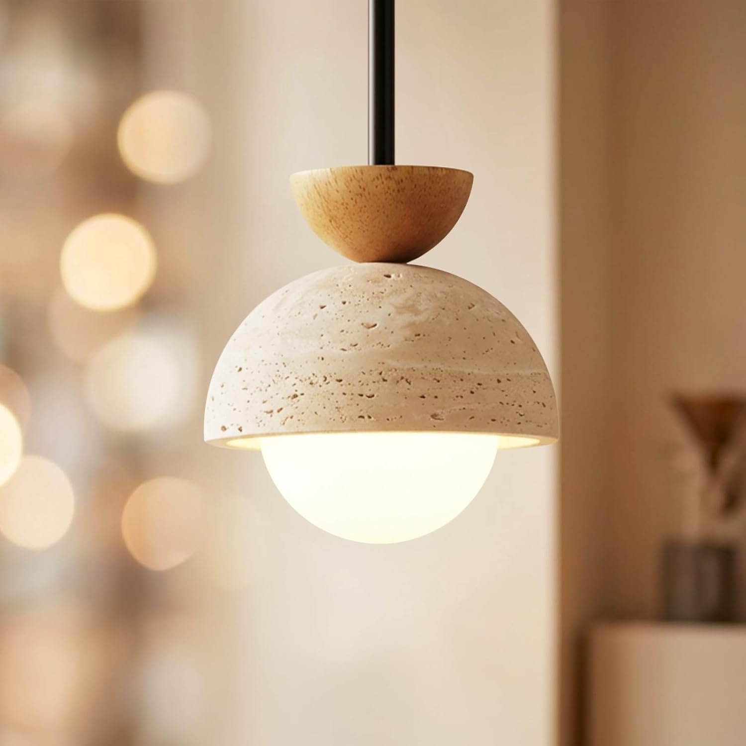 Material: Metal, Wood, Travertine Light Source: E27(Bulb not include) Power: Max 7W / 14W / 21W / 28W Finishes: Beige, Walnut Color Weight: 3 kg / 6.6 lbs Control method: Push Button Switch (dimmable) Cord length: 150cm (can be extended upon request)
