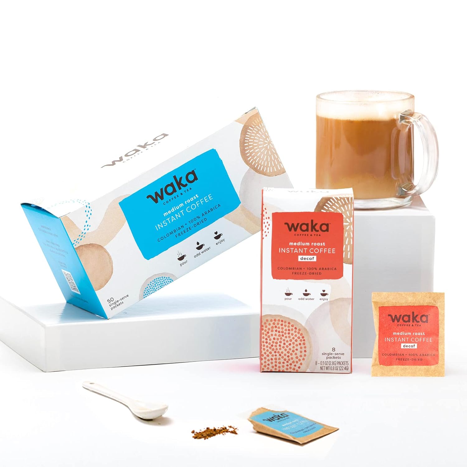 Waka Quality Instant Coffee — Single-Serve Large and Small Box Combo — 100% Arabica Freeze Dried Beans — Colombian Caffeinated and Decaffeinated