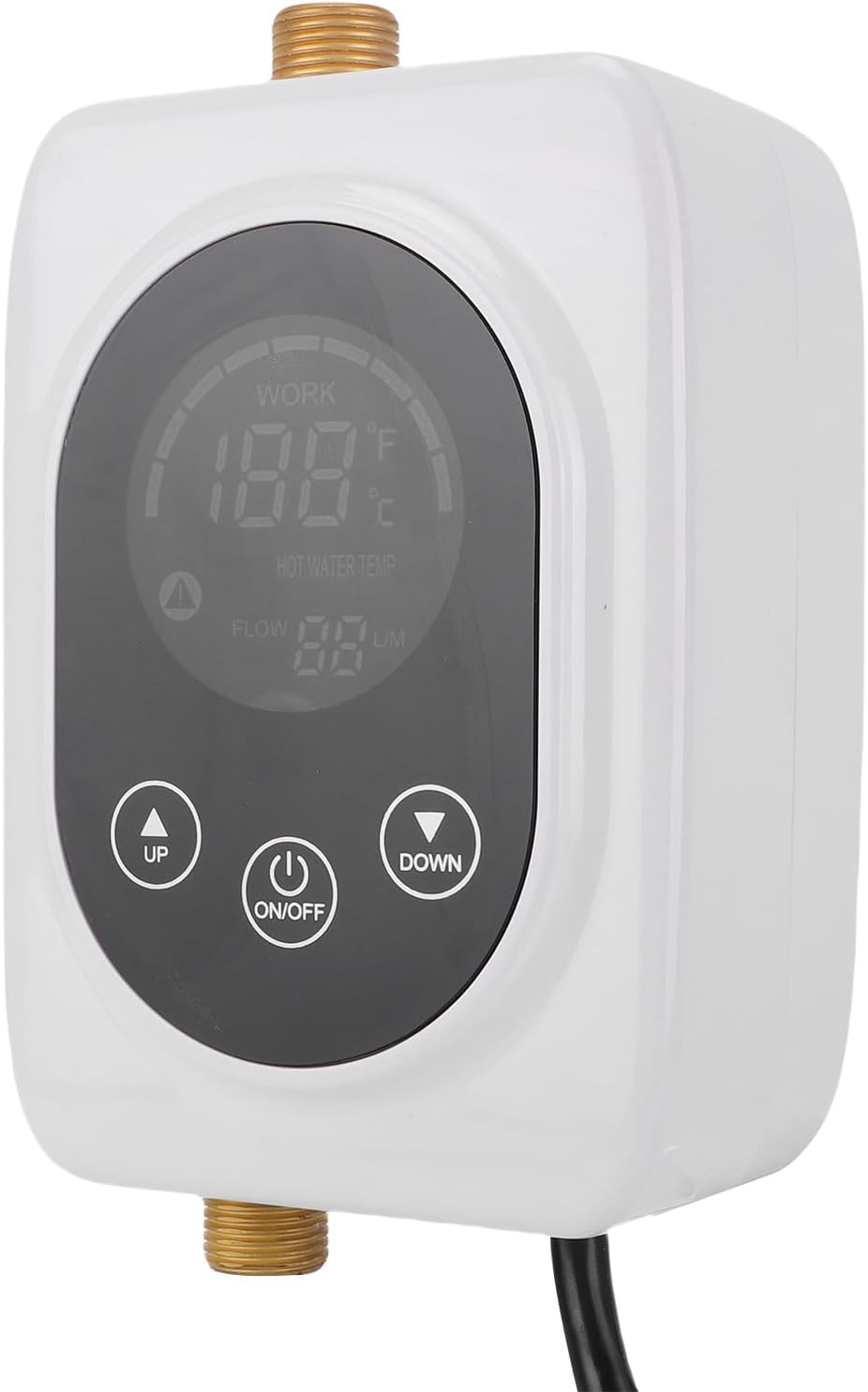 [Elegant and Intelligent Design] The tankless water heater features glossy appearance with a simple lcd touch screen display, offering intelligent self-checking functions for safety. [Easy Installation] With its compact appearance, this water heater can be easily installed under the sink, saving valuable floor space with its wall-mounted design. [Sturdy Brass Inlet and Outlet] The tankless water heater is built with brass components, ensuring durability and resistance to damage in various environments. [Automatic Performance Check] Equipped with an intuitive lcd display, this hot water heater can automatically check its working status and performance to ensure safety and efficiency. [Space-saving Design] Suitable for kitchens, apartments, bathrooms, and rvs, this electric water heater can be installed vertically to prevent heating component malfunctions. Spec: Item Type: Tankless Water Heater Model: LF001 Color: White Material: Stainless steel and brass Control Method: Touch screen Rated Power: 3000W Water Proof Grade: IPX4 Package List: 1 x Heater 2 x Screws 2 x Wall Plugs 1 x User manual How To Use: Take out the product for direct use