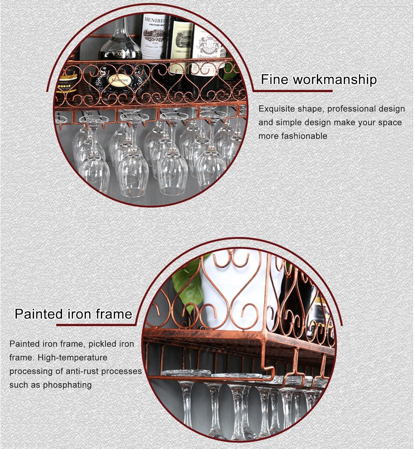 Simple yet elegant. With a very chic industrial design, it will add a lot of character to your home. Use this wall wine rack to display your wine bottles and glasses beautifully and elegantly anywhere in your home. Name: Wine Glass Holder/Wine Rack Material: Iron Metal Structure Process: Welding Furniture Structure: Frame Structure Color: Black, Bronze Dimensions: 60x25x12cm, 80x25x12cm, 100x25x12cm, 120x25x12cm, 150x25x12cm Style: Modern/Simple/Creative Use: Living Room, Bedroom, Hotel, Restaurant, Bar, Cafe *Product List: 1 Wine Rack x 1 (including installation accessories) Notes: 1. The wall mounted rack is heavy, so it is better if two people install it together. 2. This wine bottle rack does not include wine glasses and other decorations. 3. Please allow slight color difference due to shooting light and 1-3cm error due to manual measurement. Make sure you do not mind before ordering.