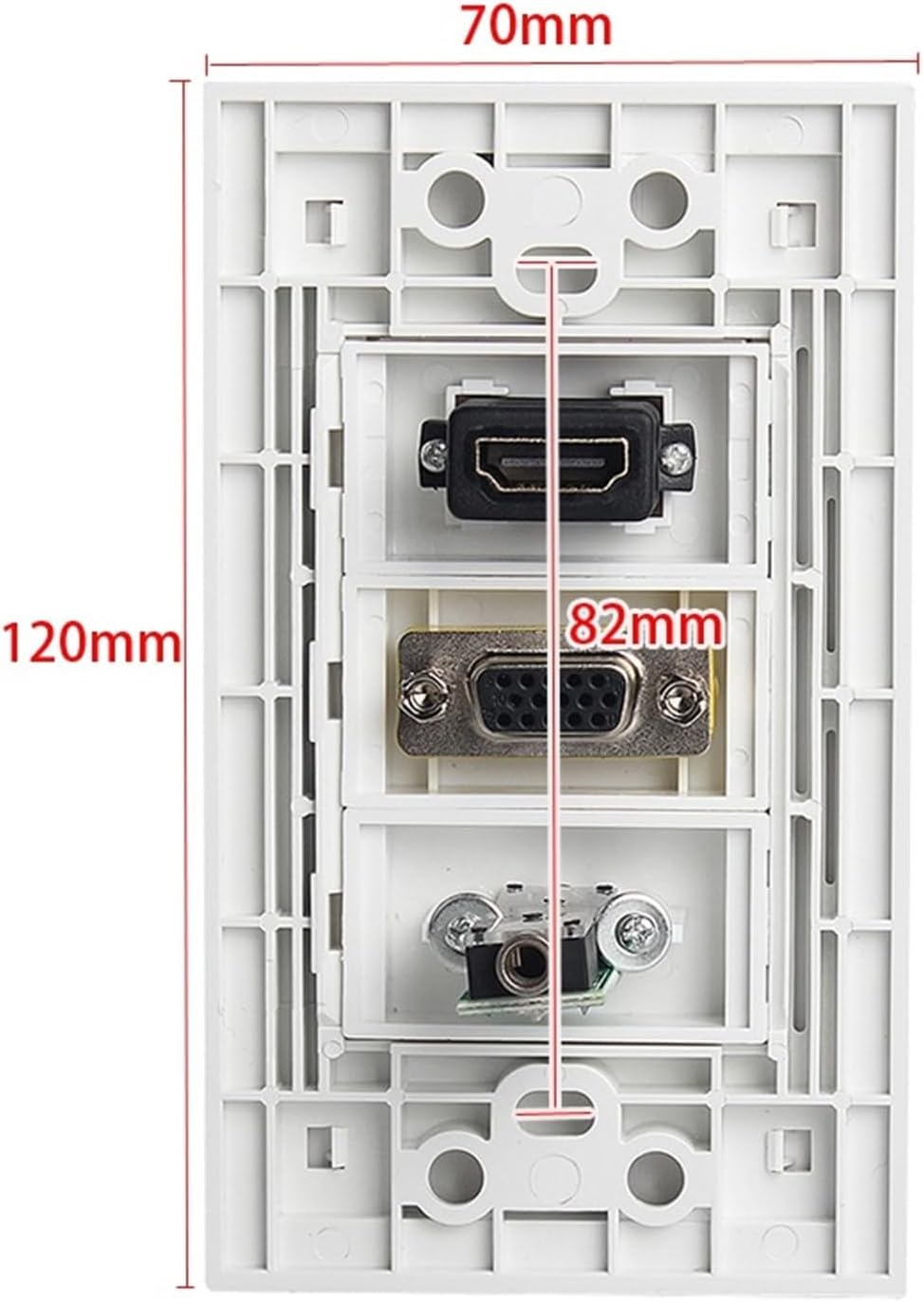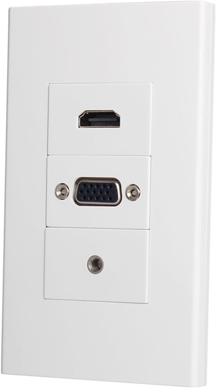 Wall Plates & ConnectorsColor: WhitePorts: HDMI + VGA + 3.5mm- HDMI version: 2.0Size: 120x70mm.Panel material: plasticEasy to install and connectScrew hole distance: 82mm.Installation: Female to female connectionFrame size: 120x70mmScrew hole distance: 82mmWith screws: YesPorts: HDMI2.0 + VGA + 3.5mm jack