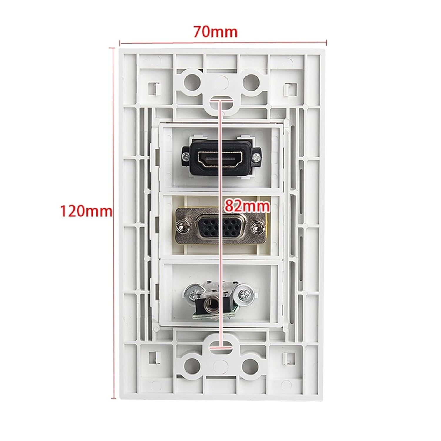 Ethernet Patch PanelsColor: WhitePorts: HDMI + VGA + 3.5mm- HDMI version: 2.0Size: 120x70mm.Panel material: plasticEasy to install and connectScrew hole distance: 82mm.Installation: Female to female connectionFrame size: 120x70mmScrew hole distance: 82mmWith screws: YesPorts: HDMI2.0 + VGA + 3.5mm jack