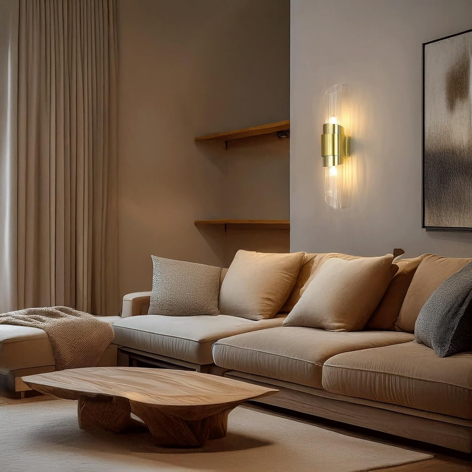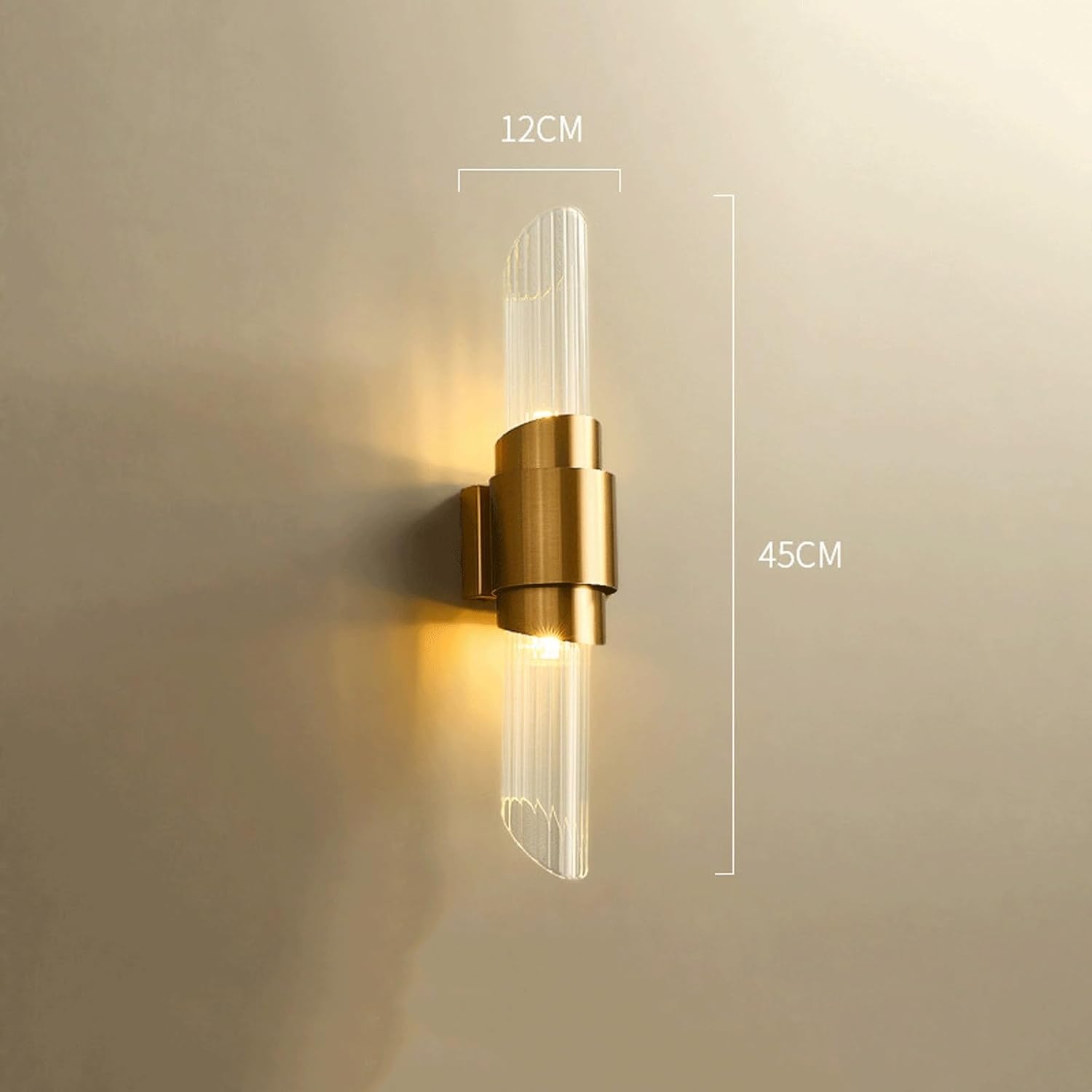Product Parameters:Type: Wall Sconce / Wall Lamp / Wall Light / Dual Direction Light / Accent Lighting / Decorative SconceStyle: Modern, Contemporary, Transitional, Nordic, Glam, Elegant, MinimalistMaterial: Metal (base/frame), Glass (shade)Color: Brass Tone (metal), Clear (glass)Dimensions:Overall Height: 17.7" (45cm)Socket Type: G9Number of Bulbs: 2Bulb Included: NoOptimized Special Feature: This modern and elegant wall sconce features a striking gold brass-toned metal body with clear fluted glass cylinders extending, offering beautiful dual-direction up and down lighting. Designed for hardwired installation, it provides a warm and inviting ambient glow, perfect for enhancing the sophisticated atmosphere of various interior spaces.Applicable Space: Ideal for Bedroom, Living Room, Hallway, Entryway, Stairway, Hotel, Dining Room, Bathroom Vanity, Corridor, or any space desiring elegant and ambient lighting.