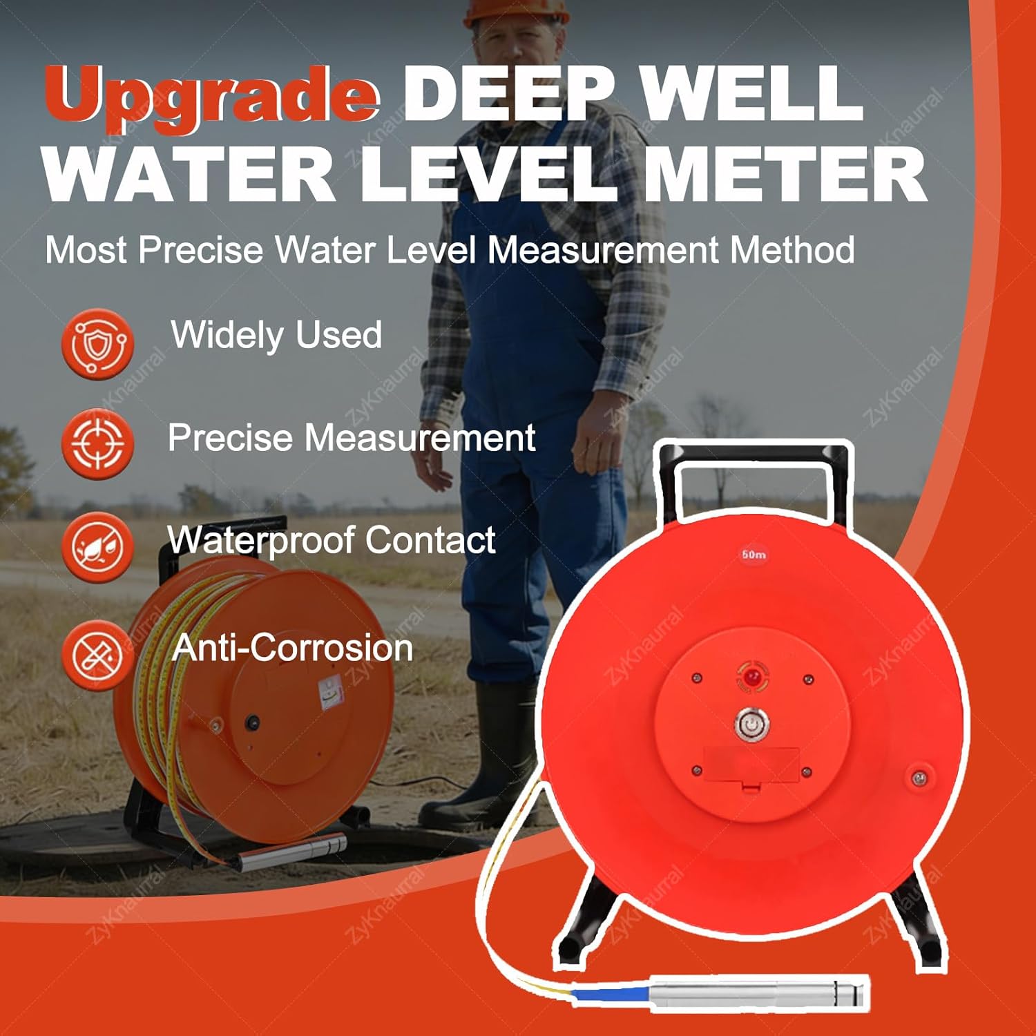 Introducing our versatile Water Level Meter, designed for accurate water level measurement in a variety of applications, including water conservancy projects, hydrology, and agriculture. This portable deep well water level meter features a fixed stainless steel probe and a durable steel tape, making it an essential tool for accurately gauging groundwater levels and well water depths ranging from 10 to 300 meters. Whether you are monitoring water levels in rural irrigation systems, reservoir dams, river levees, or even power stations, our Water Level Meter offers reliable performance and user-friendly functionality. Key Features: 1. Measurement unit: meters; Minimum reading: 1 mm; Repeatability error: ±2 mm for precise results. 2. An audible buzzer alerts you when the probe contacts water, while an indicator needle provides immediate feedback, ensuring ease of use. 3. The stainless steel probe is engineered with precise contact points, delivering dependable performance every time. 4. Ideal for measuring water levels in wells, boreholes, tanks, and water pipes. 5. Handle the probe gently to maintain the integrity of the steel cable, especially near the probe area. Specifications: - Product Name: Water Level Meter - Probe Depth Range: 0.99-inch (25 mm) for 10 to 100 meters; 0.59-inch (15 mm) for 10 to 300 meters - Measurement Ranges: 10m (3.28ft), 20m (65.6ft), 30m (98.4ft), 50m (164ft), 100m (328ft), 150m (492ft), 200m (656ft), 300m (984ft) - Resolution: 1mm (0.03in) - Operating Temperature: -20℃ to +60℃ (-4°F to +140°F) - Power Requirement: 9V battery (not included) - Material: PVC and stainless steel probe - Packing Size: 40*24*34cm (15.7×9.44×13.4 inches) Packing List: 1 x Water Depth Meter Enhance your water level monitoring with our reliable and high-performance Water Level Meter, ensuring you have the right tools for your projects.