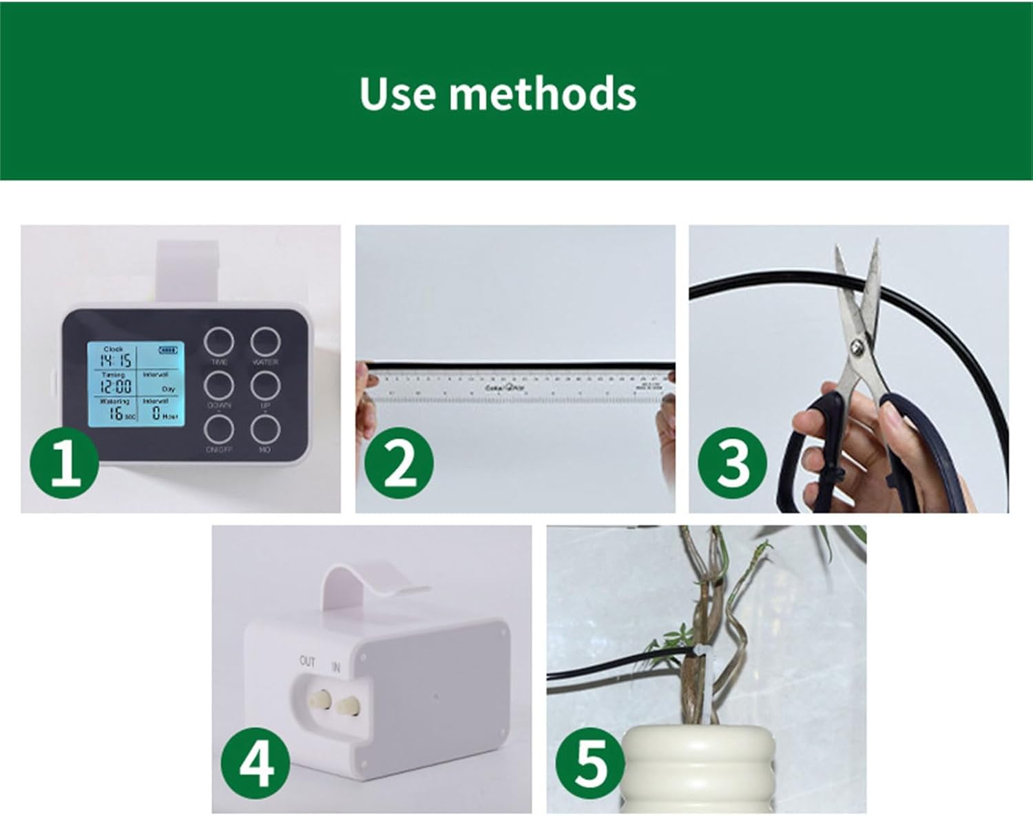 Watering Timer for Efficient Lawns and Greenhouses Irrigation Watering Timer Adjustable Drip TipsFeatures:Automatic Irrigation Controller, designed to control watering time and stop automatically, ensuring your plant receive watering Designed with a ABS exterior, this drip irrigation timer includes a 2000mAh battery, LED display, and adjustable drip speed for various plant requirements.Ideal for busy professional, gardening enthusiasts looking to maintain their plant without compromising on care.Perfect for home balcony gardens, indoor potted plant, or small outdoor farms, providing consistent watering wherever needed.With a 10/15 meter length PVC hose, this garden irrigation timer ensures durability and efficiency, making it a must have for any plant lover's toolkit.Note:This product should not be immersed in water.Specifications:Component:ABS Size: Approx.100x63x72m/3.94x2.48x2.83inch Type: 4 Option Quantity: 1 SetPackage Includes:1 Set Automatic Drip IrrigationNote:1.Please allow 1-2cm errors due to manual measurement, make sure that you donot mind before you order. 2.Due to the differences between different monitors, the picture may not reflect the actual color of the item.