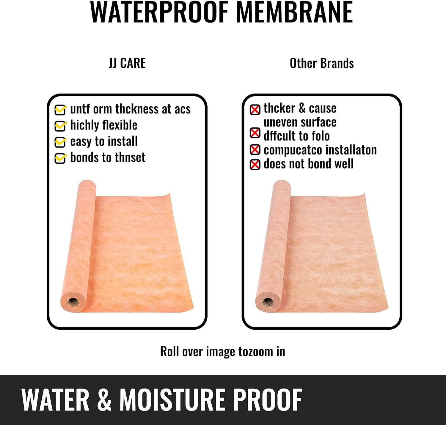 This product is made of high- quality polyethylene and consists of three layers. It has the characteristics of tear resistance, flexibility and flexibility. Waterproof and moisture- proof The thickness of this shower film is 10 mils, which is thicker than most 8 mil products on the market. It can prevent water from seeping into the tiles. Scissors can be cut You can use scissors or a knife to easily cut the coil to adapt to different floor environments. Even if you are a novice, you can complete this job. For wall and floor installation, it is recommended to install this waterproof shower membrane on the bathroom wall or under tiles or ceramics. Large coverage area The size of this tile film roll is 3.3x42. 7 feet and can cover up to 136 square feet of space. It eliminates water damage that can cause tile cracks. Professional Chalet This waterproof tile membrane is usually installed on the wall of a bathroom or sauna room. Very suitable for commercial or home use. Specifications Color: Orange Material: Polyethylene Product Size: 3.3x42. 7 ft Covering Area: 136 sq ft Thickness: 10 mils(0. 26 mm) Package Content 1 x Waterproof Membrane Specifications Color: Orange Material: Polyethylene Product Size: 3.3x91. 9 ft Covering Area: 303 sq ft Thickness: 10 mils(0. 26 mm) Package Content 1 x Waterproof Membrane Specifications Color: Orange Material: Polyethylene Product Size: 3.3x134. 5 ft Covering Area: 441 sq ft Thickness: 10 mils(0. 26 mm) Package Content 1 x Waterproof Membrane Specifications Color: Orange Material: Polyethylene Product Size: 3. 3x23 ft Covering Area: 75. 3 sq ft Thickness: 10 mils(0. 26 mm) Package Content 1 x Waterproof Membrane