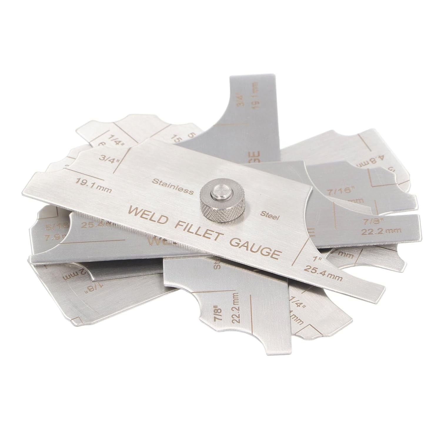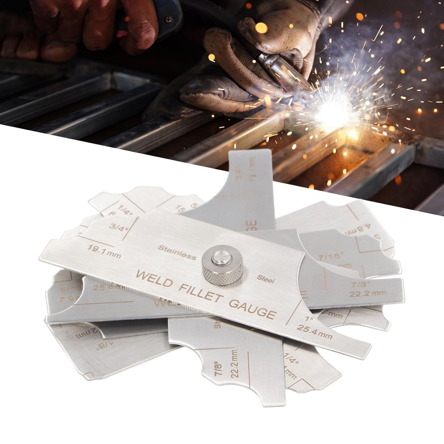 Spec:Item Type: Weld Fillet GaugeMaterial: Stainless SteelProcess: Accuracy Grinding, EngravingApplicable for detection in boilers, bridges, shipbuilding, pressure vessels, oilfield pipelines. Also suitable for measuring welded components with high quality requirements.Metric Measuring Range: 3mm, 4mm, 5mm, 6mm, 8mm 9mm, 10mm, 11mm, 12mm, 14mm, 16mm, 19mm, 22mm and 25mm.Inch Measuring Range: 1/8in(3.2mm), 3/16in(4.8mm), 1/4in(6.4mm), 5/16in(7.9mm), 3/8in(9.5mm), 7/16in(11.1mm), 1/12in(12.7mm), 5/8in(15.9mm), 3/4in(19.1mm), 7/8in(22.2mm), and 1in(25.4mm).Package List:1 x Welding Measure Tool1 x Leather Bag1 x Instruction Manual