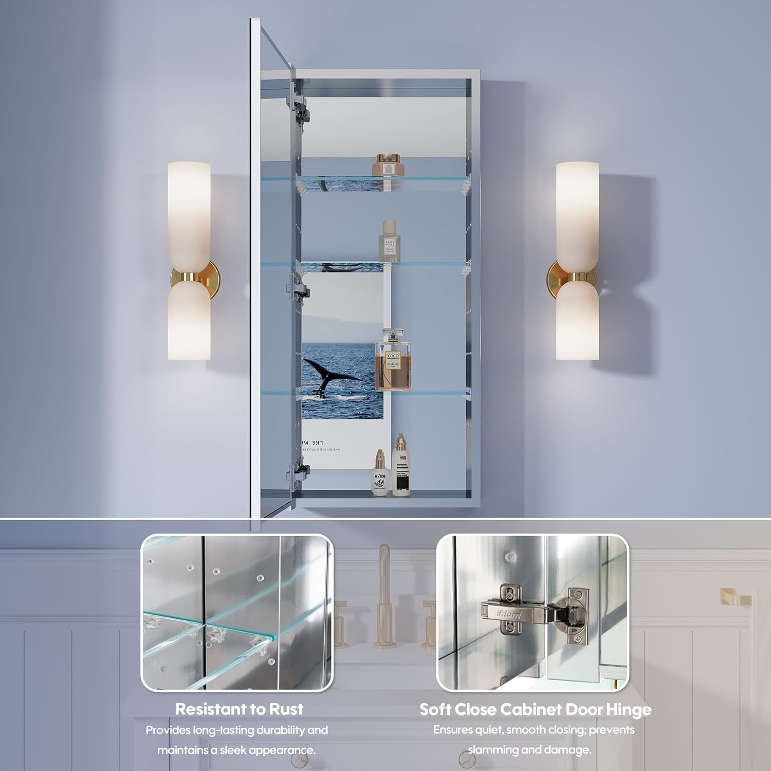 | Additional Features | Tempered mirror+Adjustable glass shelves+Soft-close door+Reverisble Installation+Surface or Recessed Mount |
