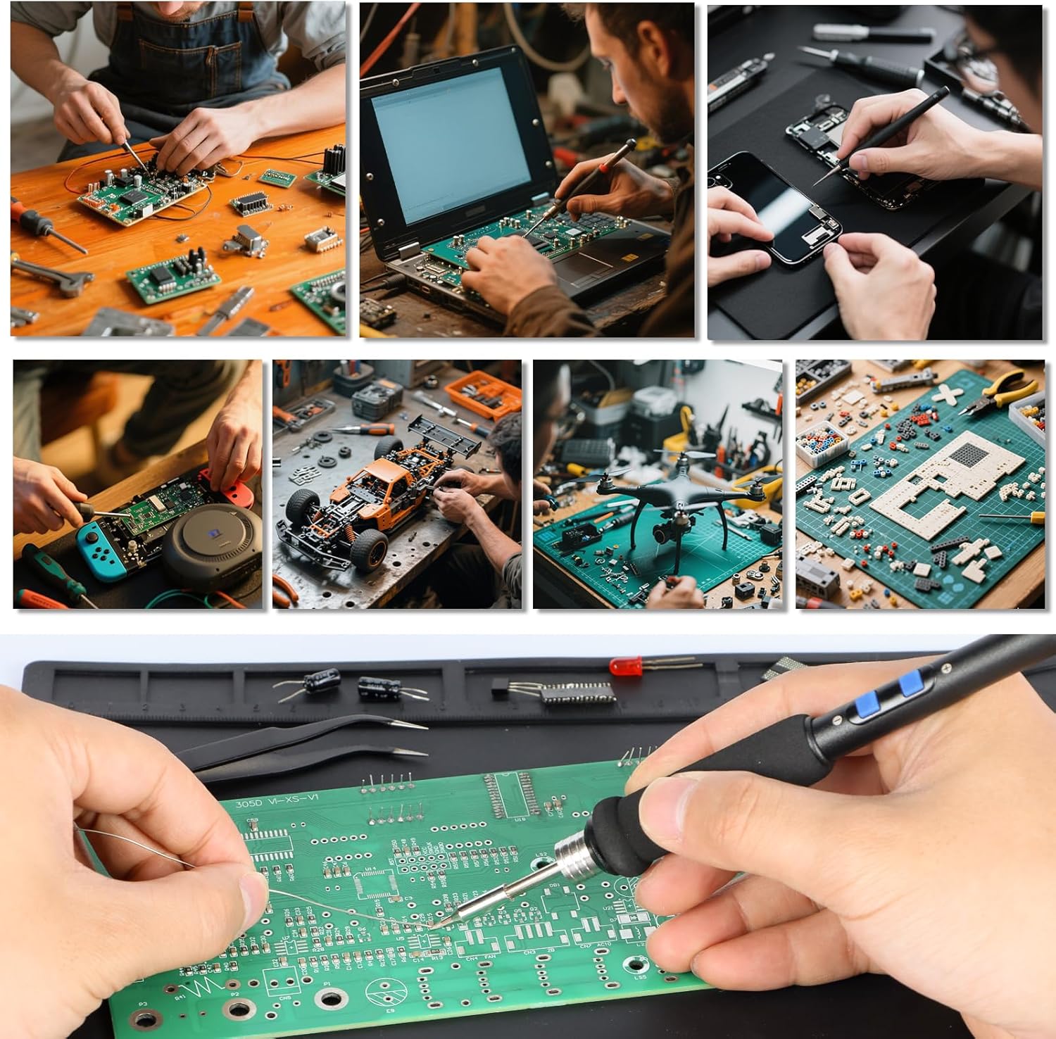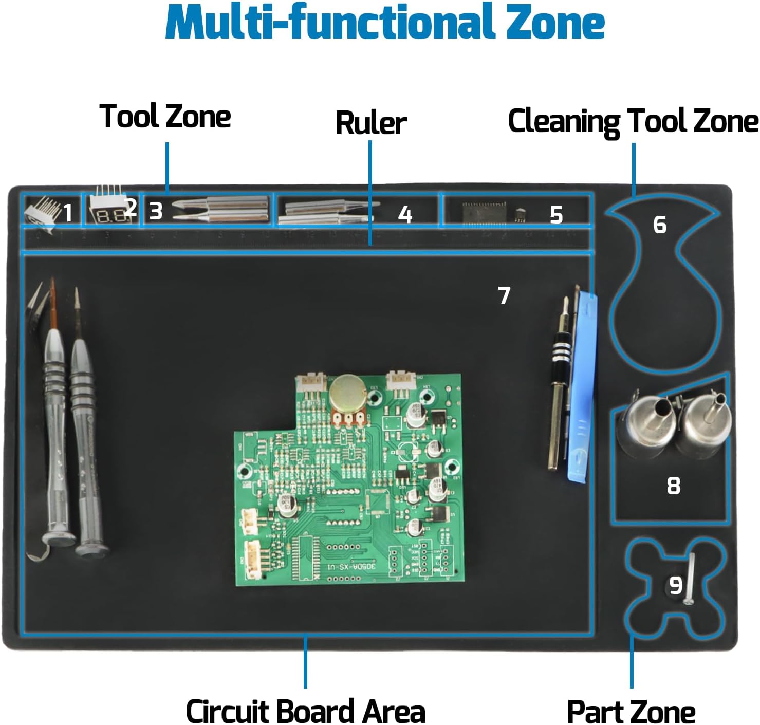 | Included Components | 2 solder wire, 3 hot air nozzles, 5 soldering tips(I,B,K,3.2D,3C), ESD-safe tweezers, WEP 882D hot air rework soldering station, WEP M150 12.9x8.2 inches heat-resistant silicone work mat, brass wool tip cleaner, desoldering pump, holder |